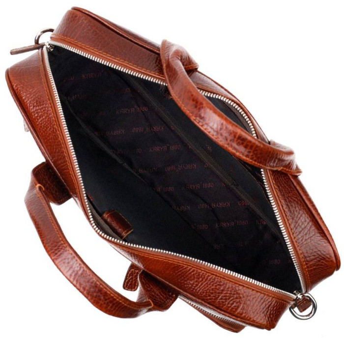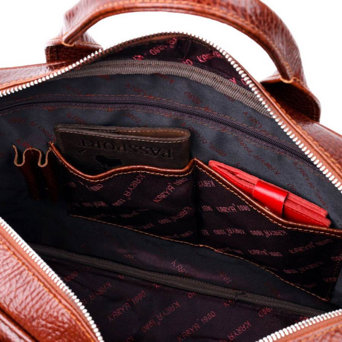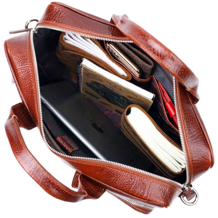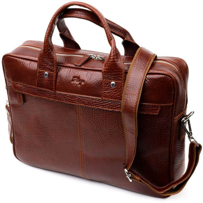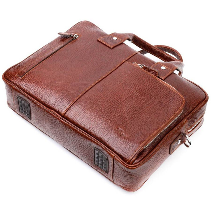 Практичный портфель из натуральной крупнозернистой кожи, коричневого цвета. Удобная и многофункциональная модель. Модель дополнена фурнитурой цвета серебра, плюс резиновые ножки для защиты внешнего дна сумки. Внутри сумки качественная подкладка. Сумку можно переносить в руке при помощи удобных кожаных ручек, а также через плечо (в комплекте съемный, регулируемый плечевой ремень, который выполнен в комбинации текстильного материала и натуральной кожи). Будет идеальным вариантом для подарка близкому человеку.
