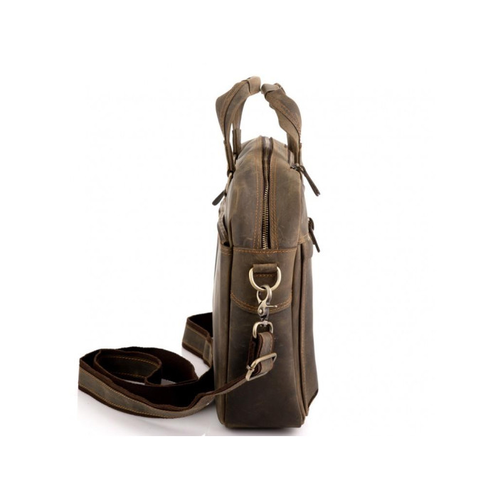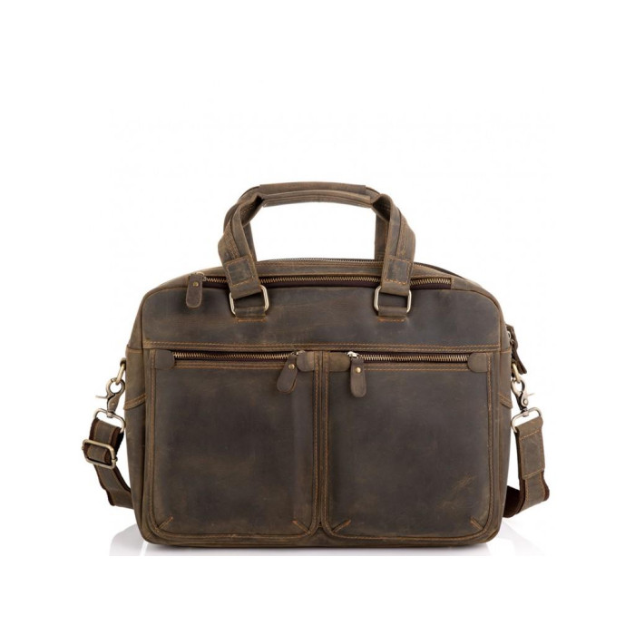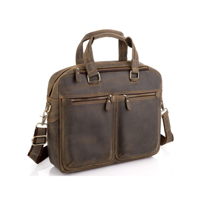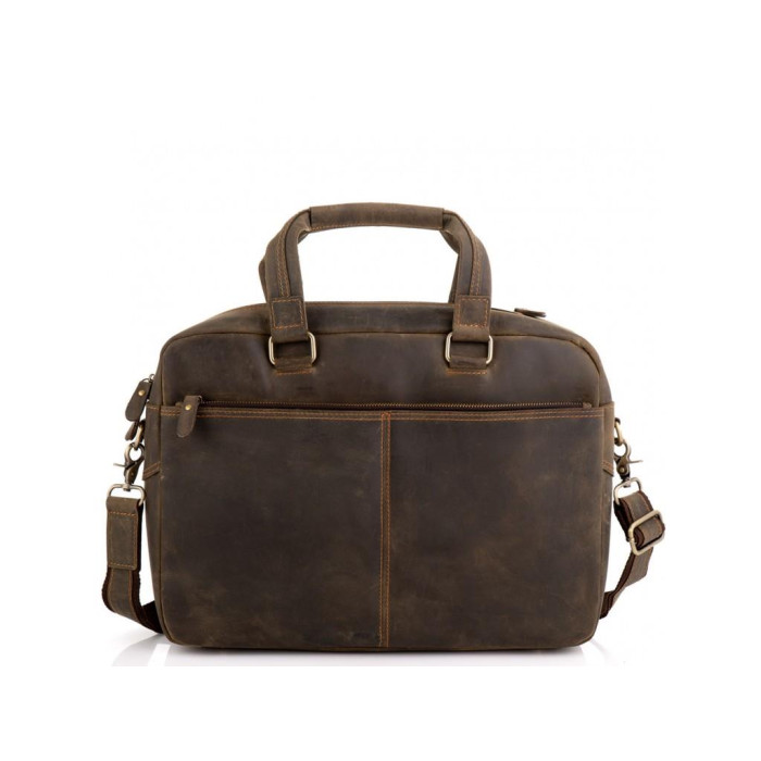 Мужская деловая сумка для ноутбука и документов из лошадиной кожи с винтажной поверхностью. Подойдет для ноутбуков 14 и 15 дюймов. Снизу сумки есть 5 металлических ножек, для носки можно использовать как кожаные ручки, так и плечевой ремень. Фурнитура - золотая, пуллера - кожаные. Сумка мужская имеет одно основное отделение. С лицевой стороны есть два небольших кармана на молнии, а также карман сверху на молнии горизонтального типа, с тыльной стороны расположен карман на молнии. Внутри сумки есть маленькие карманы открытого типа, карман на молнии, а также карман на липучке для гаджета.