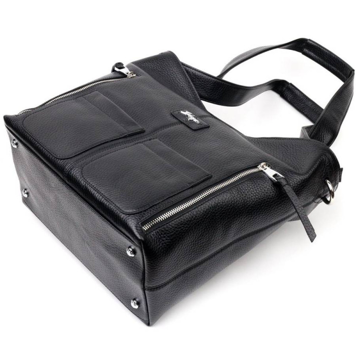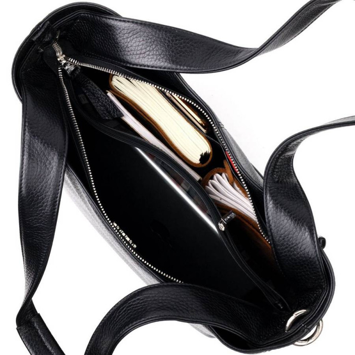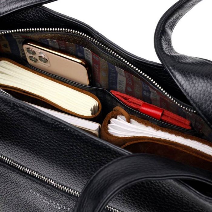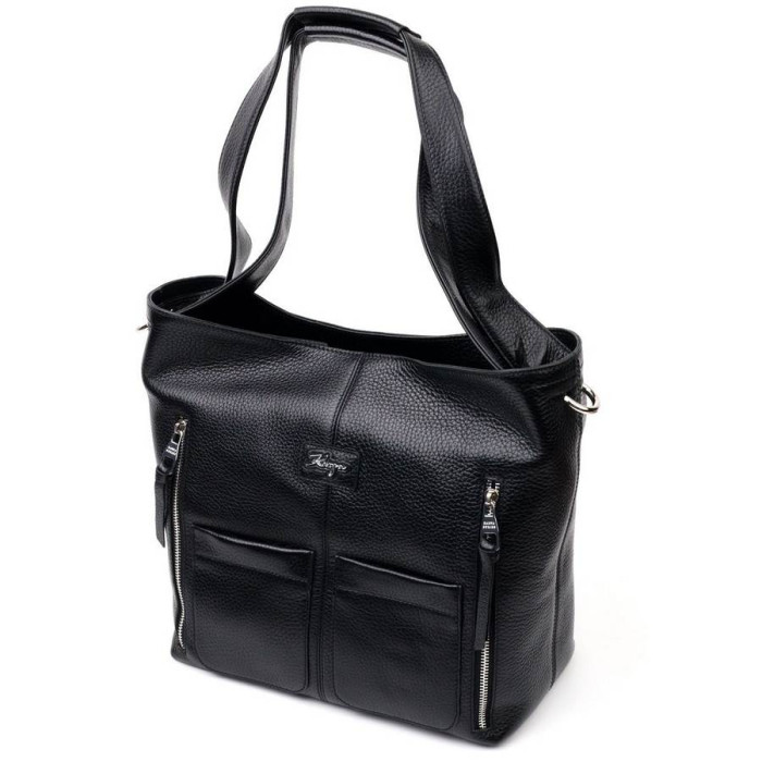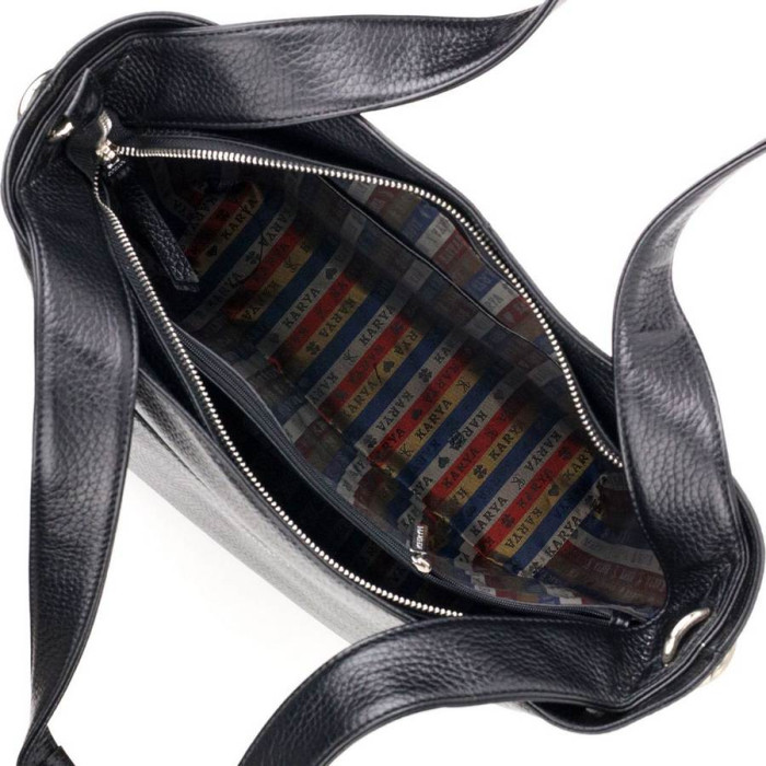 Вместительная женская сумка большого размера из натуральной кожи, в классическом черном цвете. Фурнитура серебряного цвета. Сумку удобно носить в руке, на плече. Сумка упакована в фирменный текстильный чехол Karya. Сумка из натуральной кожи всегда будет отличным подарком любой женщине.