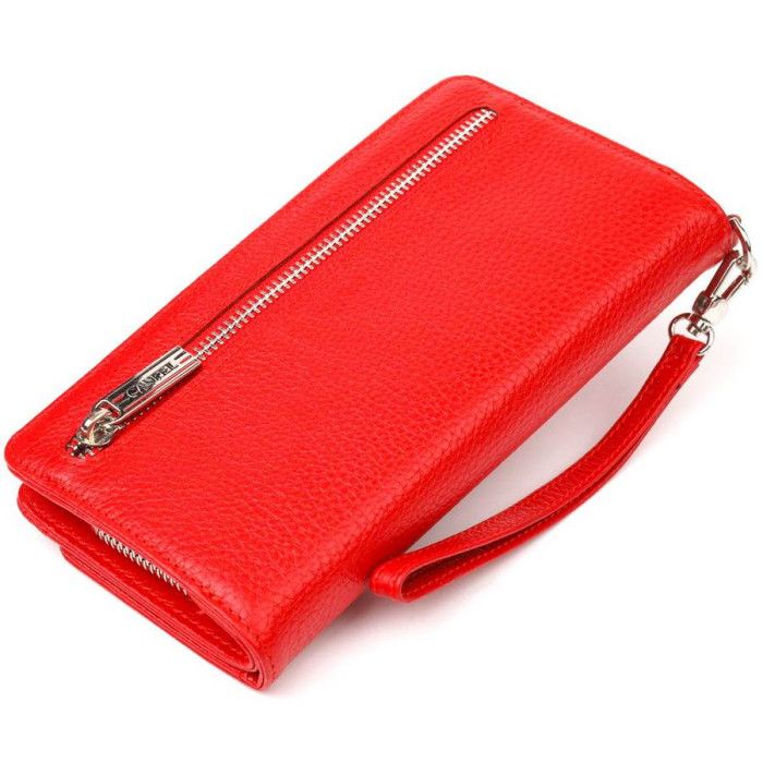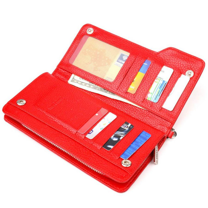 Вместительный женский кошелек- клатч, из натуральной зернистой кожи, в ярком красном цвете. Аксессуар имеет одно основное отделение, в которое помещаются купюры всех номиналов, двенадцать карманов для карточек, один из которых под сеточкой, блок для карт с внешней стороны, два кармашка на молнии, съемный кистевой ремень. Закрывается аксессуар на молнию, а блок для карт закрывается на кнопки. Цвет фурнитуры – серебро. Кожаный кошелек является удивительным подарком для жены, девушки, подруги.
