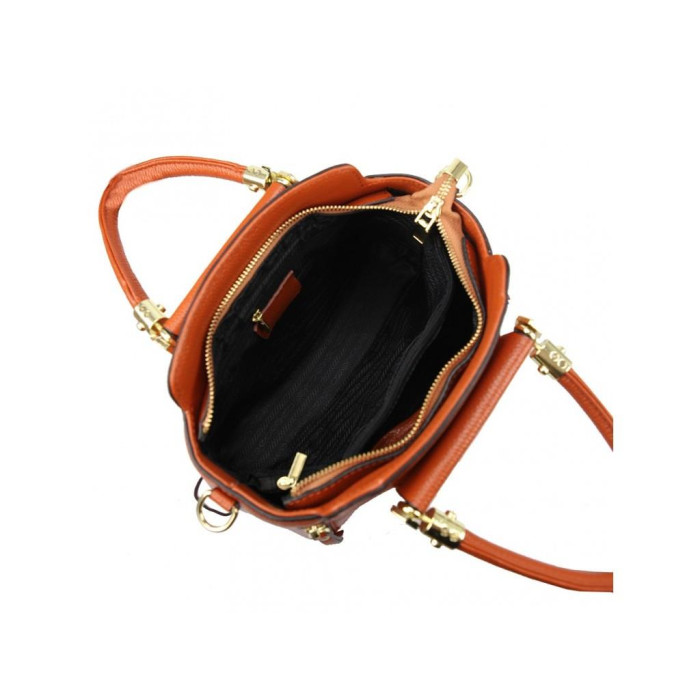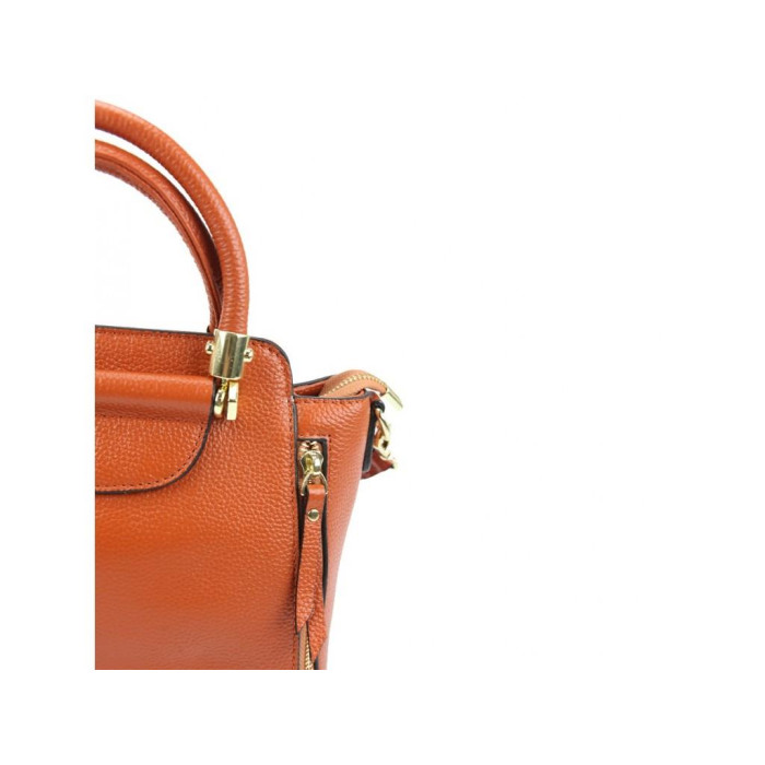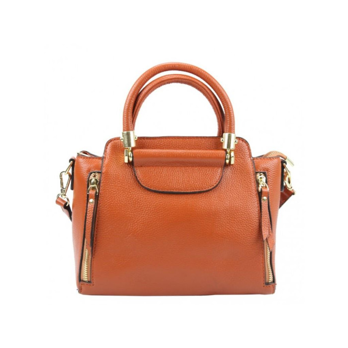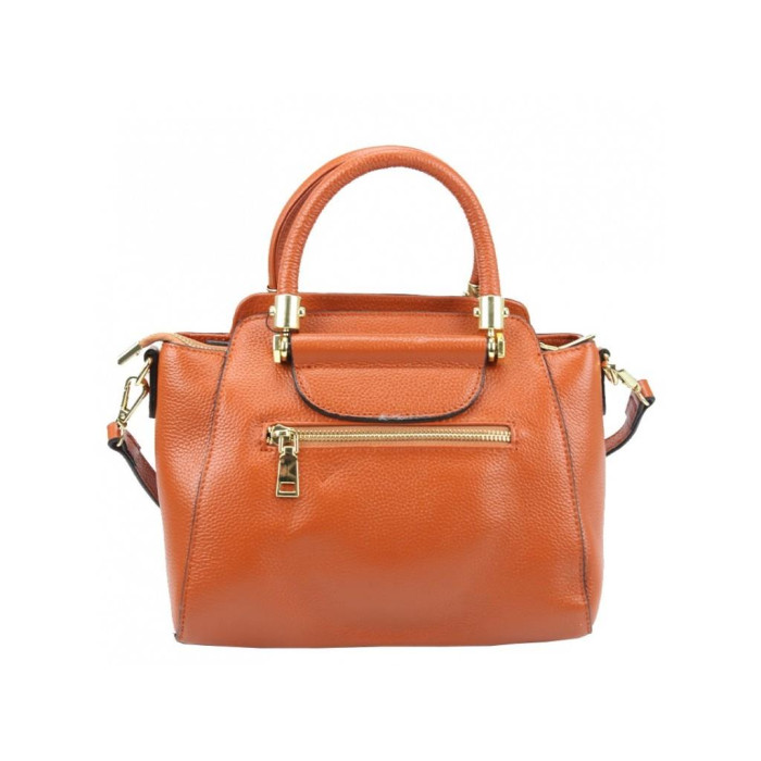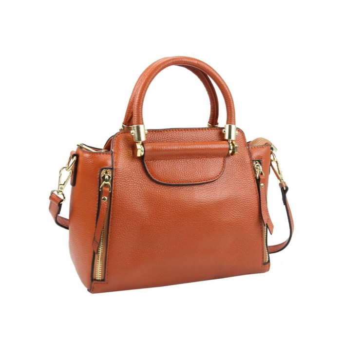 Женская кожаная сумка с твердыми складывающимися ручками. Внутри разделительный карман на молнии. С тыльной стороны также есть карман на молнии.