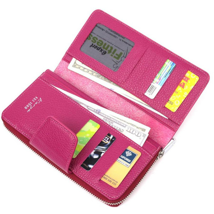 Прекрасный женский кошелек из качественной натуральной кожи. Изделие состоит из двух частей, первая - для купюр в не сложенном виде и монет, что закрывается на молнию, вторая для карточек и документов, закрывается клапаном на магнит. Упакован аксессуар в фирменную коробку и пакет бренда. Изделия из натуральной кожи всегда будут отличным подарком для близкого человека.