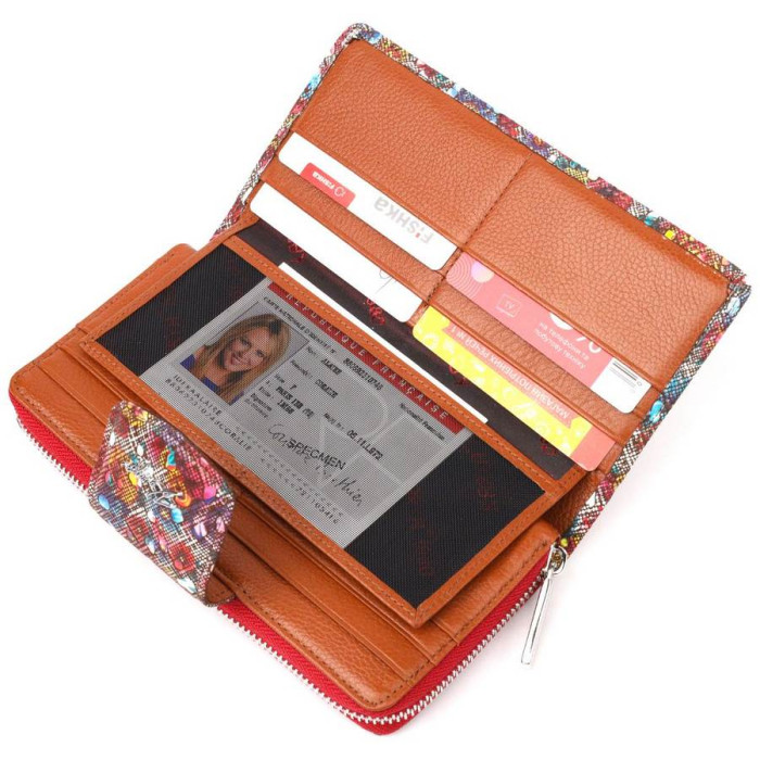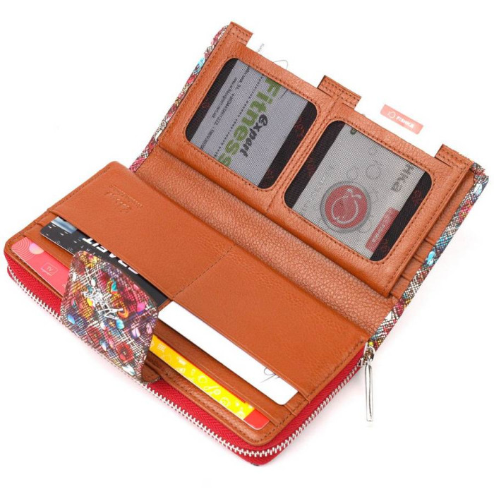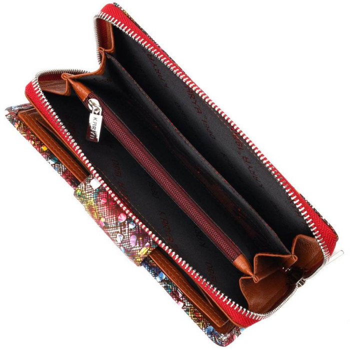 Очень красивый женский кошелек из качественной натуральной кожи. Изделие состоит из двух частей, первая - для купюр в не сложенном виде и монет, что закрывается на молнию, вторая для карточек и документов, закрывается клапаном на магнит. Упакован аксессуар в фирменную коробку и пакет бренда. Изделия из натуральной кожи всегда будут отличным подарком для близкого человека.
