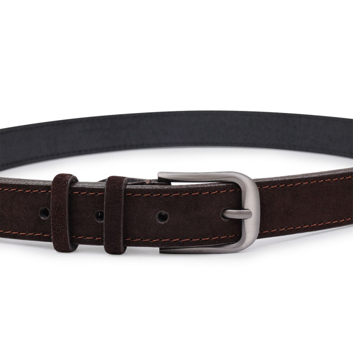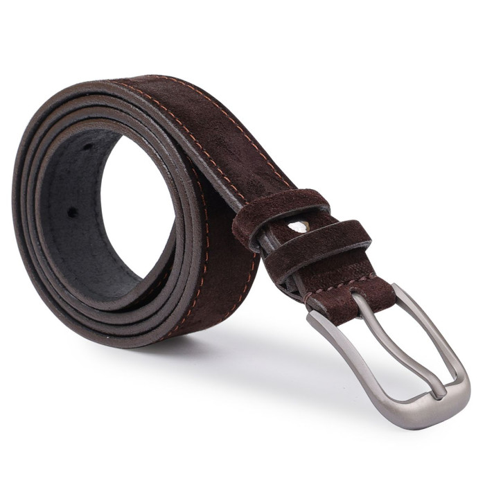 Модный и современный замшевый ремень в очень красивом темно-коричневом цвет с шоколадным оттенком, а по бокам идет строчка чуть светлее, что смотрится просто шикарно. Материал изготовления – натуральная высококачественная кожа с отменными эксплуатационными характеристиками. Такой ремень – просто находка для Вашего гардероба.