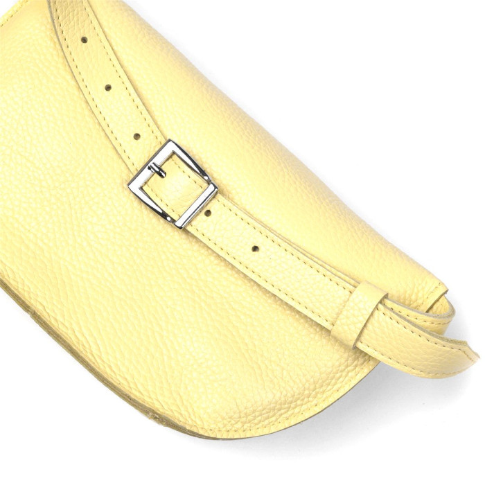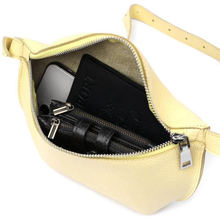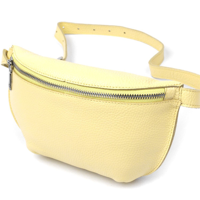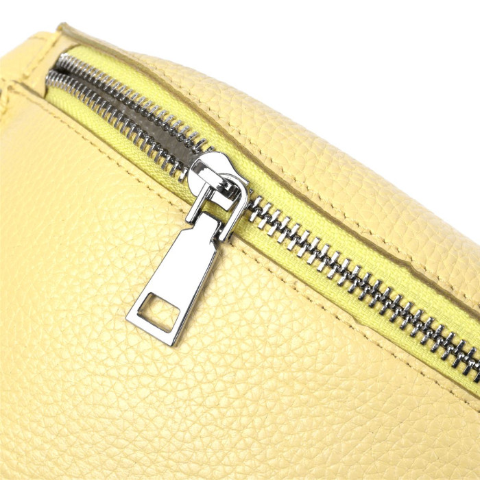 Отличная женская сумка на пояс в приятном сочном лимонном цвете из натуральной высококлассной кожи с отменными характеристиками. Имеет одно просторное отделение. Фактура модели имеет матовую зернистую поверхность. Фурнитура представлена в серебренном цвете. Данная модель – прекрасный подарок любимой девушке, подруге или сестре.