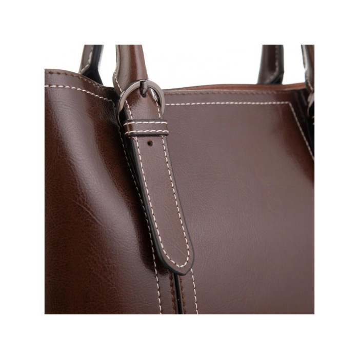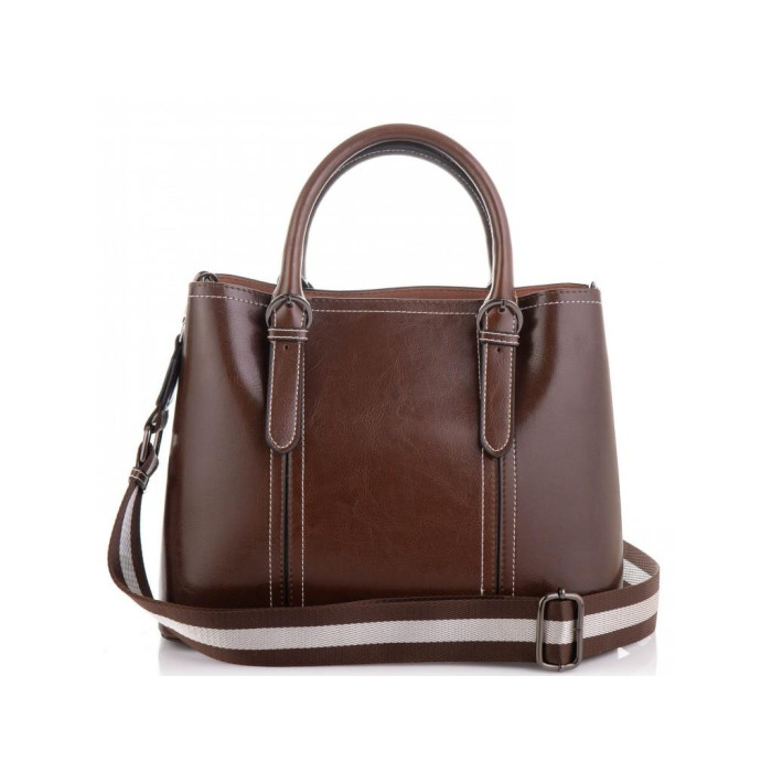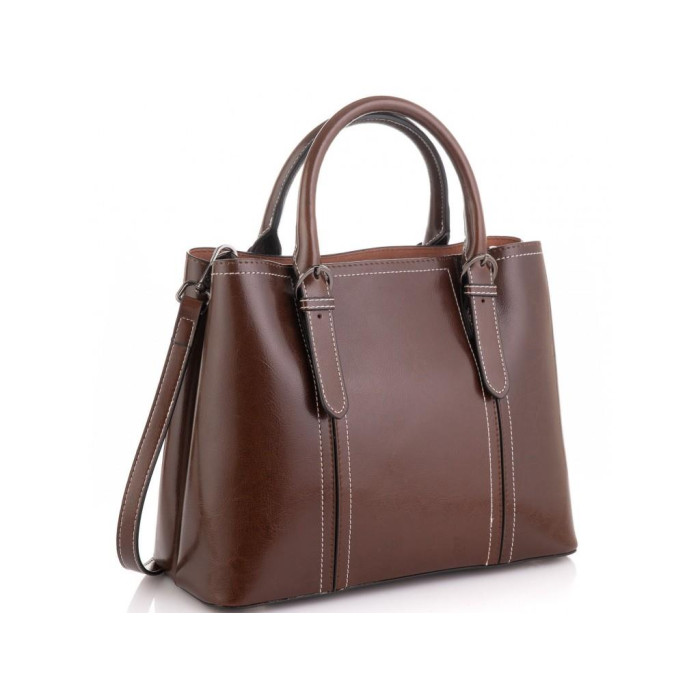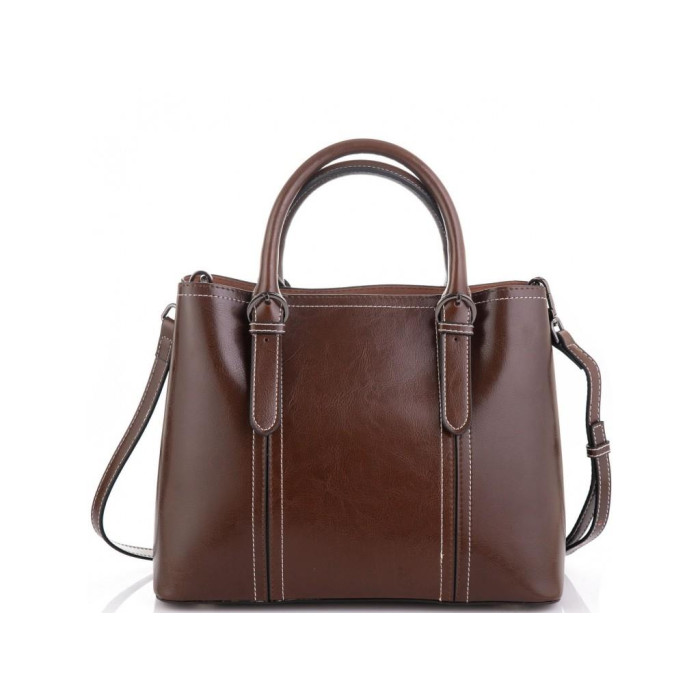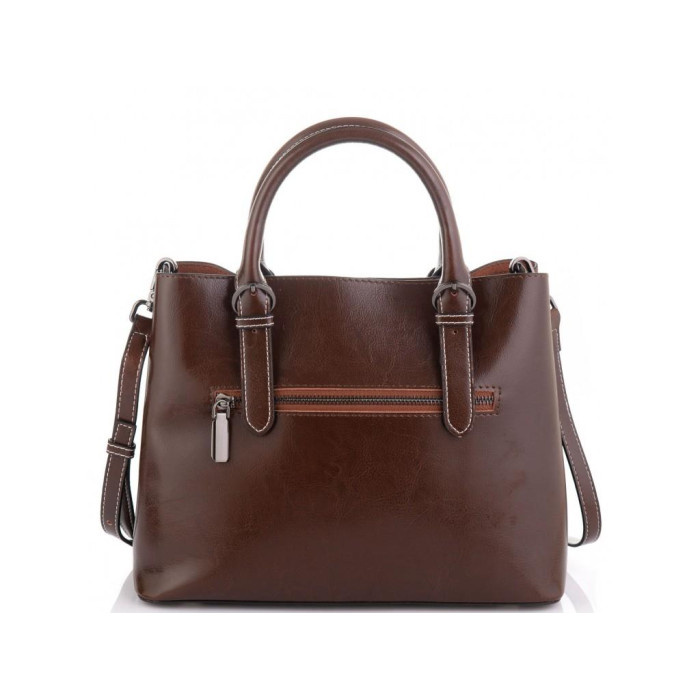 Компактная кожаная женская сумка в красивом коричневом цвете. Для носки есть удобные кожаные ручки, кожаный плечевой ремень, а также наплечный текстильный ремень. Фурнитура темное-серебро. Сумка имеет одно основное отделение, которое внутри разделено карманом перегородкой на молнии, также внутри есть карман на молнии и карман открытого типа. С тыльной стороны карман на молнии.