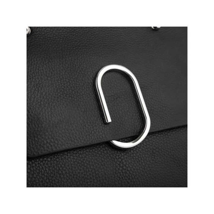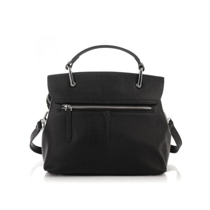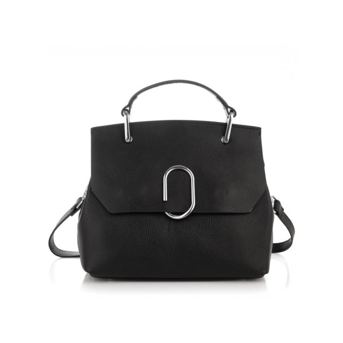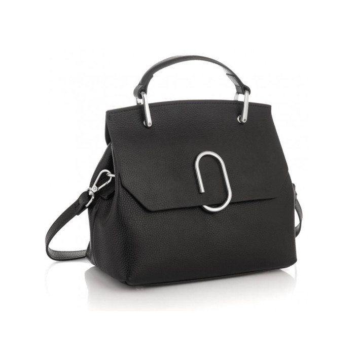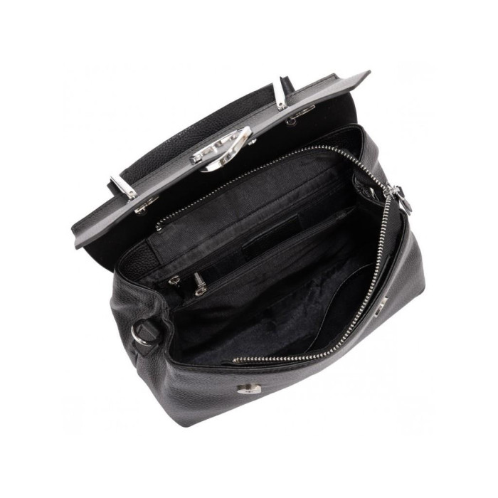 Женская кожаная сумка в черном цвете с декоративным клапаном. Для носки есть удобная кожаная ручка и кожаный плечевой ремень. Сумка имеет одно основное отделение, которое внутри разделено карманом перегородкой на молнии, также внутри есть карман на молнии и карман открытого типа. Фурнитура серебристая металлическая.