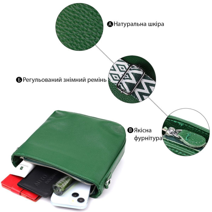Зелёная кожаная сумка — идеальный выбор для тех, кто ценит оригинальность, функциональность и стиль в одном аксессуаре.