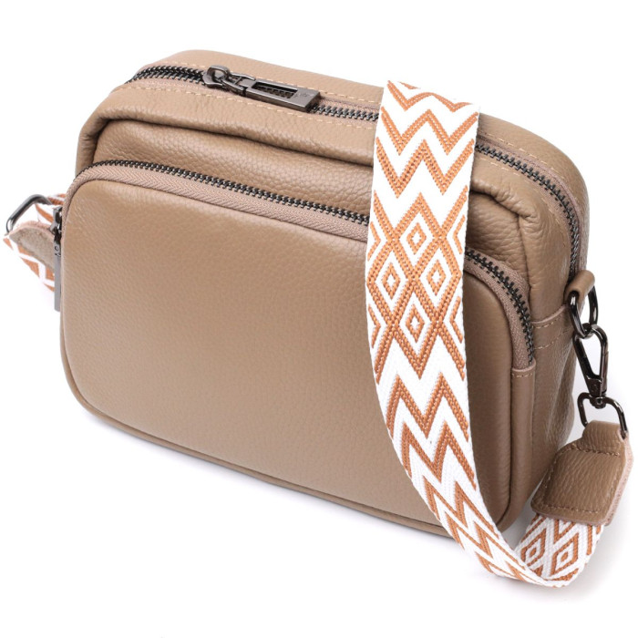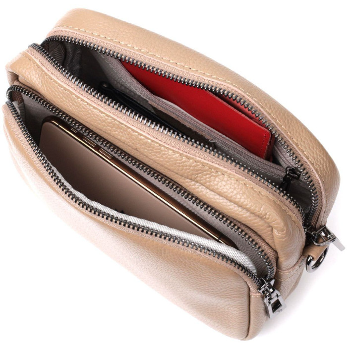 Интересная женская сумка с накладным карманом на лицевой стороне. Изделие пошито из качественной натуральной кожи, которая долго носится и не теряет свой первоначальный вид. Аксессуар состоит из одного основного отделения внутри которого расположен карман открытого типа и карман на молнии, также снаружи расположен карман на молнии, на тыльной стороне и накладной карман на молнии, на лицевой стороне. Носить сумку можно в руке как клатч, на плече и через плечо, для этого имеется текстильный съемный ремень. В изделии использована качественная фурнитура цвета темного серебра. Универсальный вариант сумки как на вечер так и в качестве сумочки на каждый день.