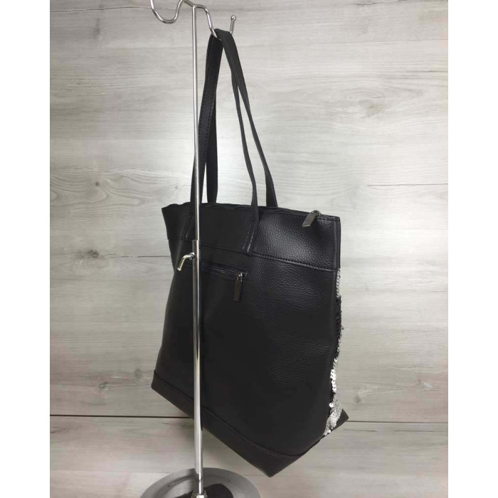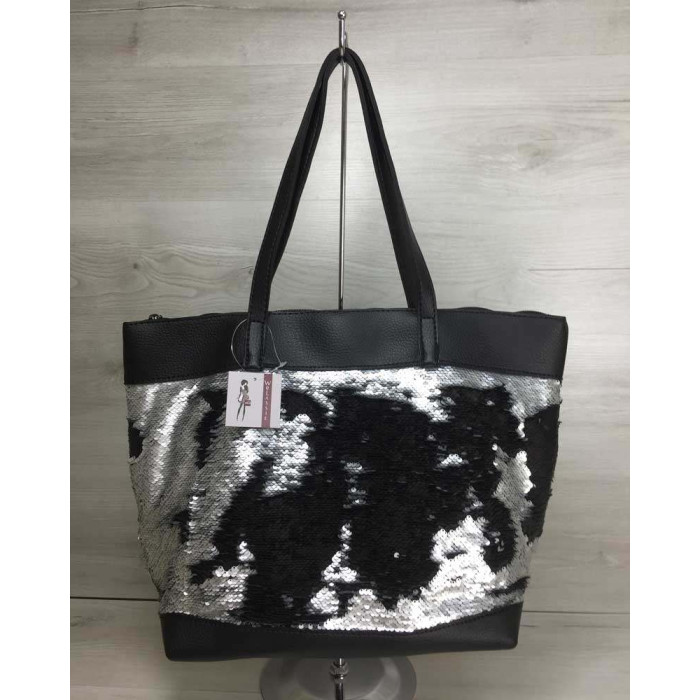 Женская сумка "Пляж", изготовлена из искусственной кожи. Передняя часть сумки украшена двухсторонними пайетками. Открывается при помощи молнии. Внутри имеет плотную подкладку и два кармана, один на молнии, другой открытый. Снаружи- карман на молнии для мелких предметов. Длина ручек рассчитана, чтобы носить сумку на плече.