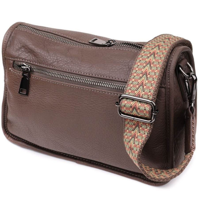 Фурнитура цвета серебра красиво контрастирует с тёплым тоном коричневой кожи, добавляя аксессуару сдержанного блеска. В комплект входят два съёмных ремешка — кожаный и текстильный, что позволяет менять стиль и способ ношения сумки в зависимости от настроения и случая.