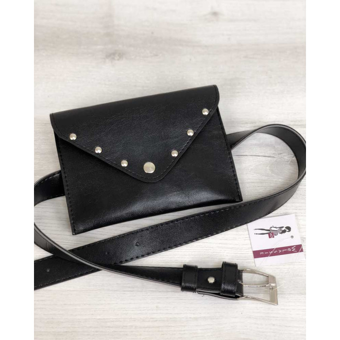 Женский клатч на пояс, изготовлен из искусственной кожи. Крышка открывается при помощи кнопки. Внутри одно отделение. Крышка по периметру украшена крабиками. Длина поясного ремня 105 см.