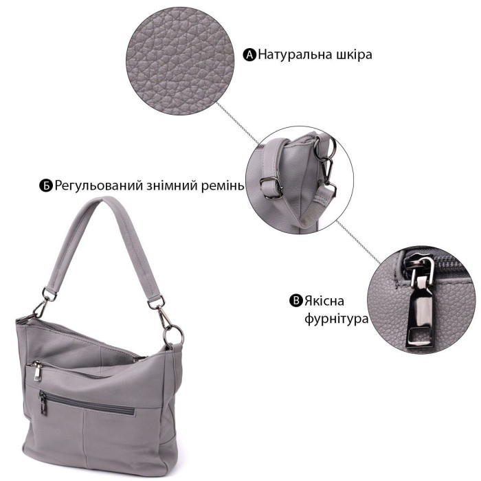 Эта элегантная сумка из натуральной кожи в утонченном сером цвете — гармоничное сочетание современного дизайна и практичности. Идеальный выбор для повседневного использования, деловых встреч или прогулок по городу.