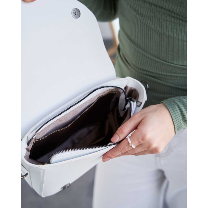 Сумка женская 11000 от производителя «Welassie» Украина, цвет белый, материал сумки экокожа высокого качества. Сумка открывается при помощи магнитов под крышкой, и молнии. Сумка на плотной, качественной подкладке. Внутри имеет открытый карман. Так же имеется карман на молнии снаружи.