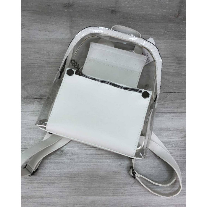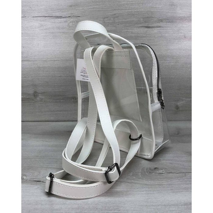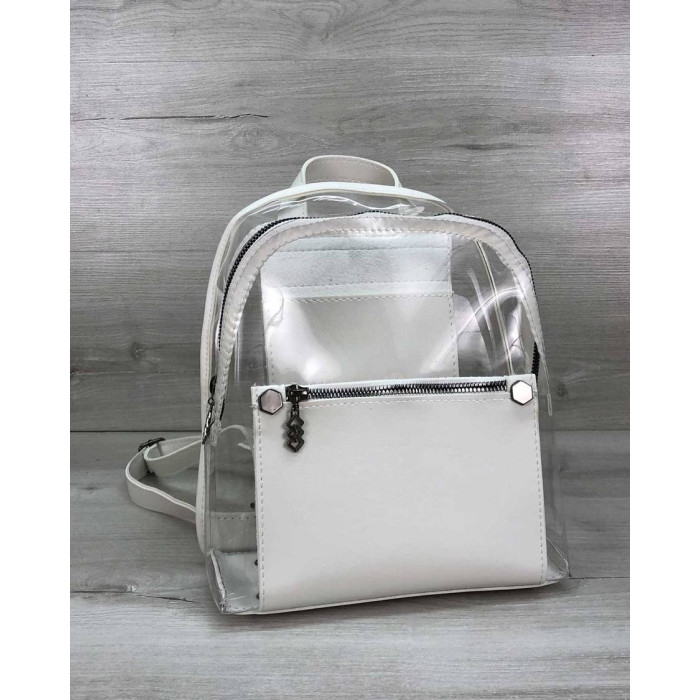 Жіночий молодіжний рюкзак Бонні білий з силіконом (прозорий), виготовлений з еко-шкіри. Має одне відділення та зовнішню кишеню для дрібних предметів. Всередині рюкзак без підкладки, має одну внутрішню кишеню. Ручки регулюються під різну довжину.