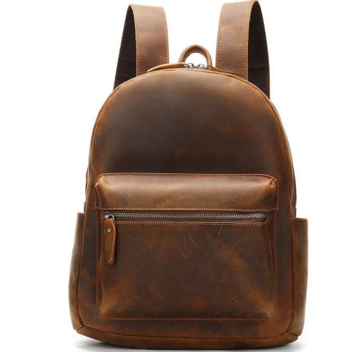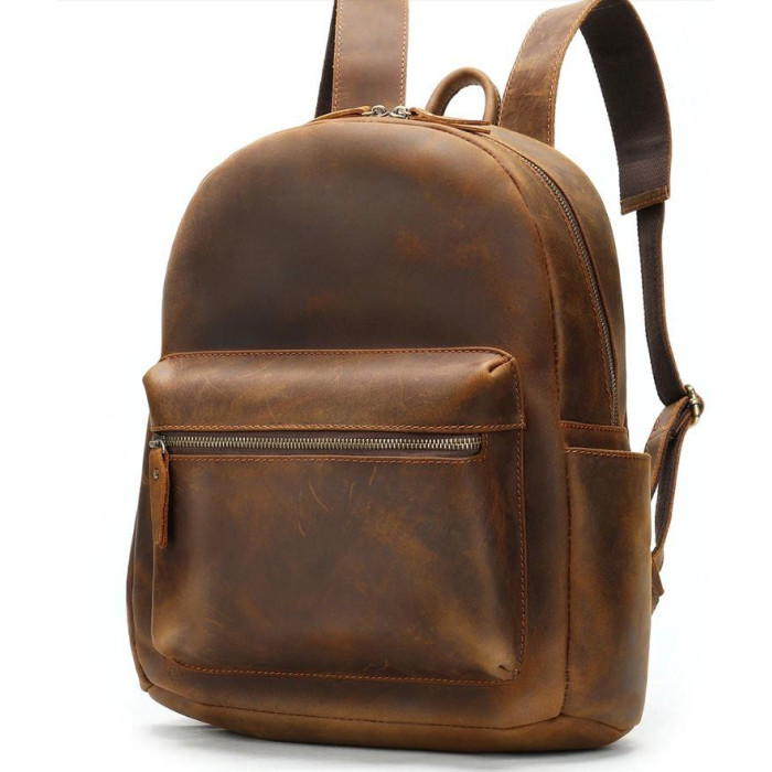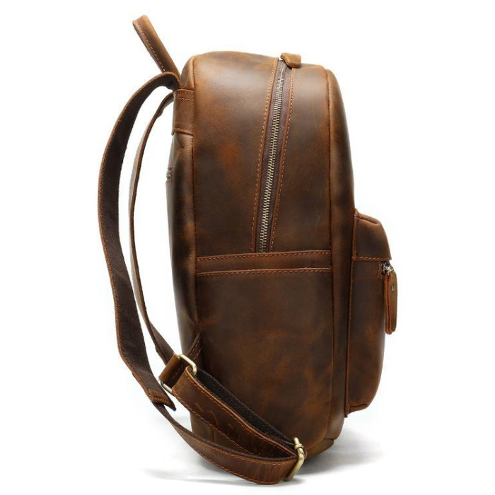 Вмісткий рюкзак для ноутбука. Хороший варіант, щоб носити з собою ноутбук на роботу або в подорож. Сумка з ефектом старовини виглядає дуже стильно і по багатому. У рюкзаку ви можете носити також документи або речі. Модель прошита рудою ниткою і доповнена фурнітурою золотистого кольору.
