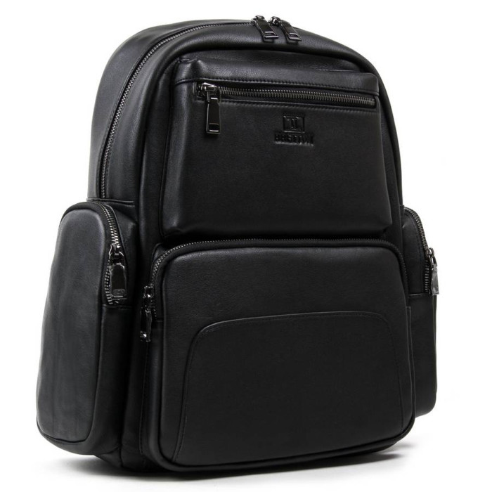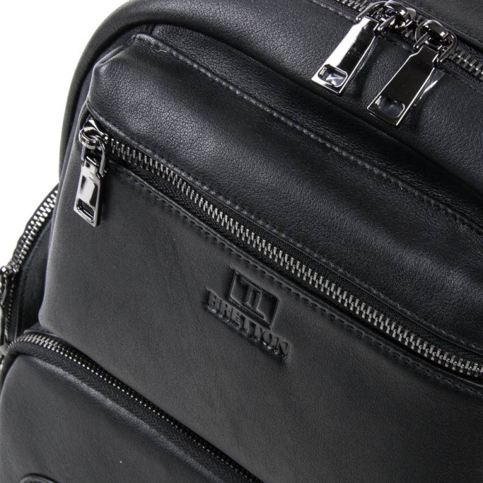 Великий чоловічий шкіряний рюкзак Bretton. Одне відділення, закривається на блискавку. Всередині знаходиться велика кишеня на блискавки і кишеню для нетбука або планшета. На фасаді рюкзака розташовані два великих кишені на блискавці, і на торцях рюкзака також є кишені на блискавці. Широкі і м'які плечові лямки регулюються по довжині. Розмір (см.) 35 * 39 * 17