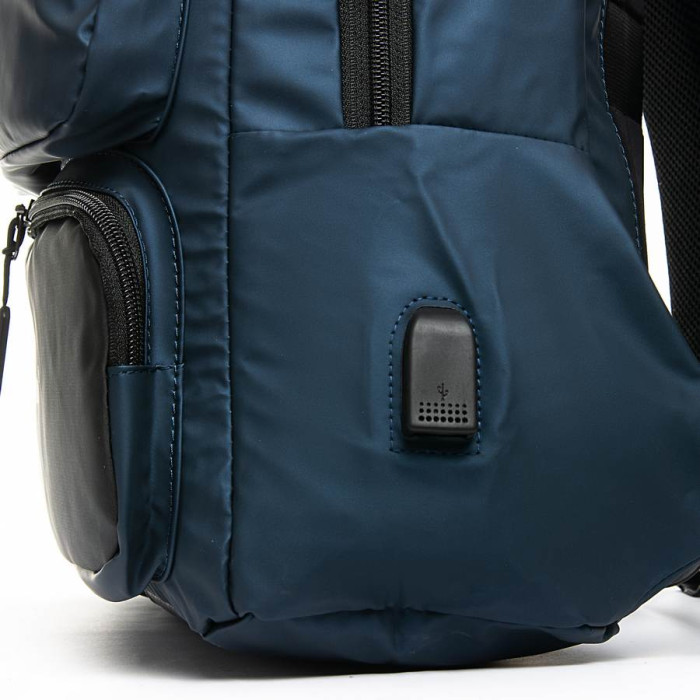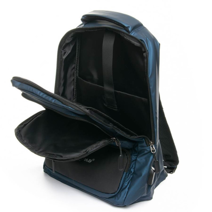Рюкзак міський Lanpad. Виготовлений з матеріалу з водовідштовхувальним покриттям. Щільна спинка. Два відділення, закриваються на блискавку. Всередині є бічний відкритий Подвійний кишеню і кишеню для ноутбука. З відділення виведений на зовнішню бічну стінку USB кабель. На фасаді знаходяться дві великі кишені на блискавці. На задній стінці є кріплення на ручку валізи. Плечові лямки регулюється по довжині.