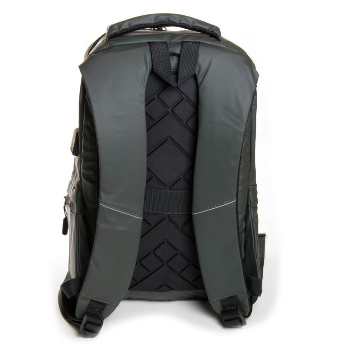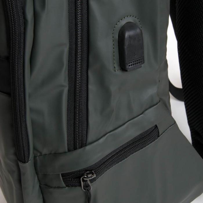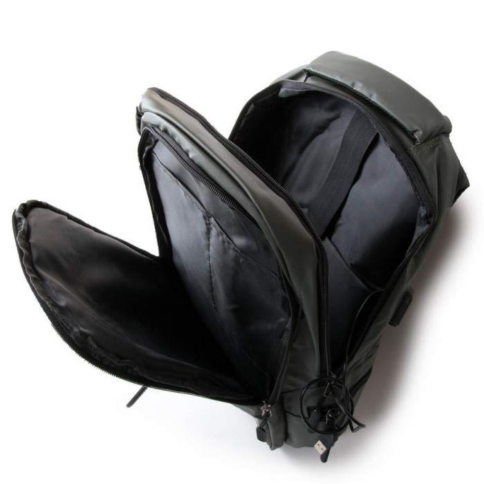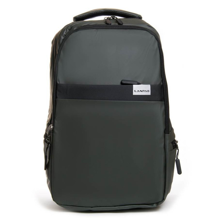 Рюкзак міський Lanpad. Виготовлений з матеріалу з водовідштовхувальним покриттям. Щільна спинка. Два відділення, закриваються на блискавку. Всередині є бічний відкритий Подвійний кишеню і кишеню для ноутбука. З відділення виведений на зовнішню бічну стінку USB кабель. На фасаді знаходиться велика кишеня на блискавці, а на бічних стінках невеликі кишені. На задній стінці є кріплення на ручку валізи. Плечові лямки регулюється по довжині.