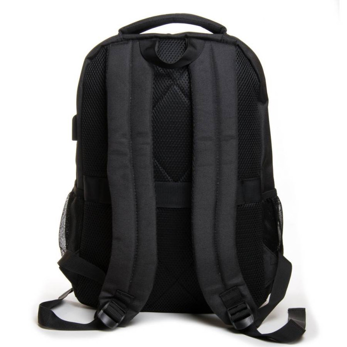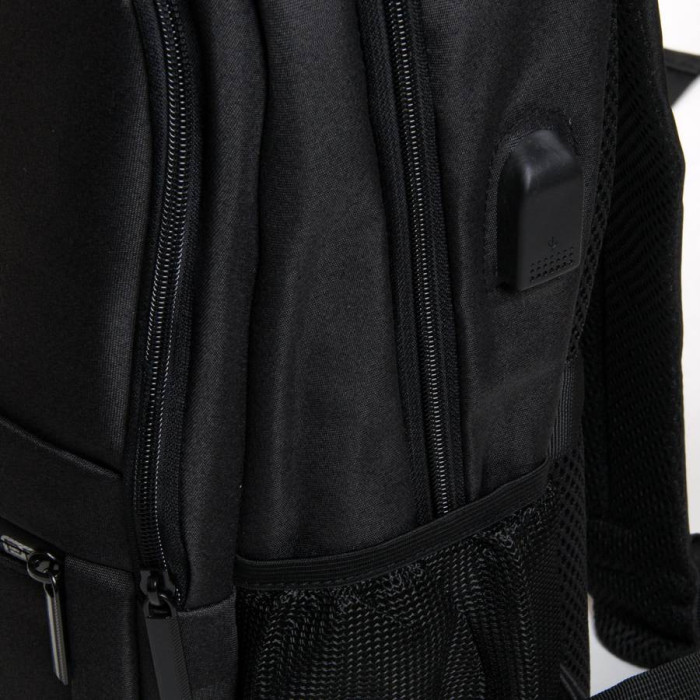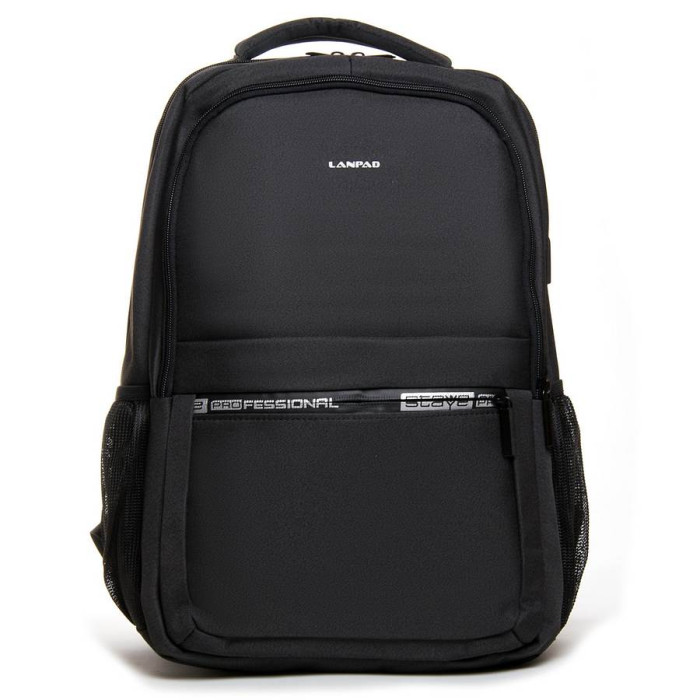 Рюкзак міський Lanpad. Виготовлений з щільного матеріалу. Ущільнена вентильована спинка. Два відділення, закриваються на блискавку. Всередині є бічний відкритий Подвійний кишеню і кишеню для ноутбука. З відділення виведений на зовнішню бічну стінку USB кабель. На фасаді знаходяться дві великі кишені на блискавці. А на бічних стінках - відкриті кишені-сітки. На задній стінці є кріплення на ручку валізи. Плечові лямки регулюється по довжині.