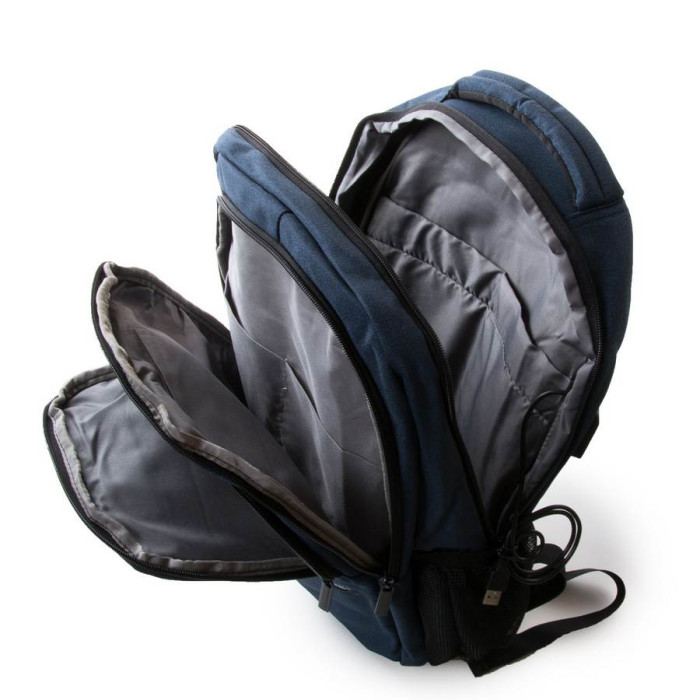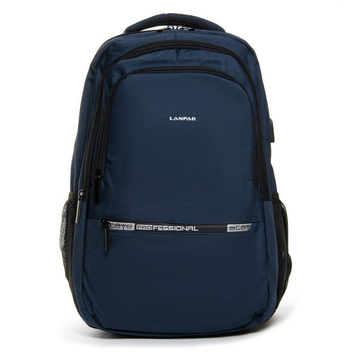 Рюкзак міський Lanpad. Виготовлений з щільного матеріалу. Ущільнена вентильована спинка. Три відділення, закриваються на блискавку. Всередині є бічний відкритий Подвійний кишеню і кишеню для ноутбука. З відділення виведений на зовнішню бічну стінку USB кабель. На фасаді знаходиться велика кишеня на блискавці. А на бічних стінках - відкриті кишені-сітки. На задній стінці є кріплення на ручку валізи. Плечові лямки регулюється по довжині.