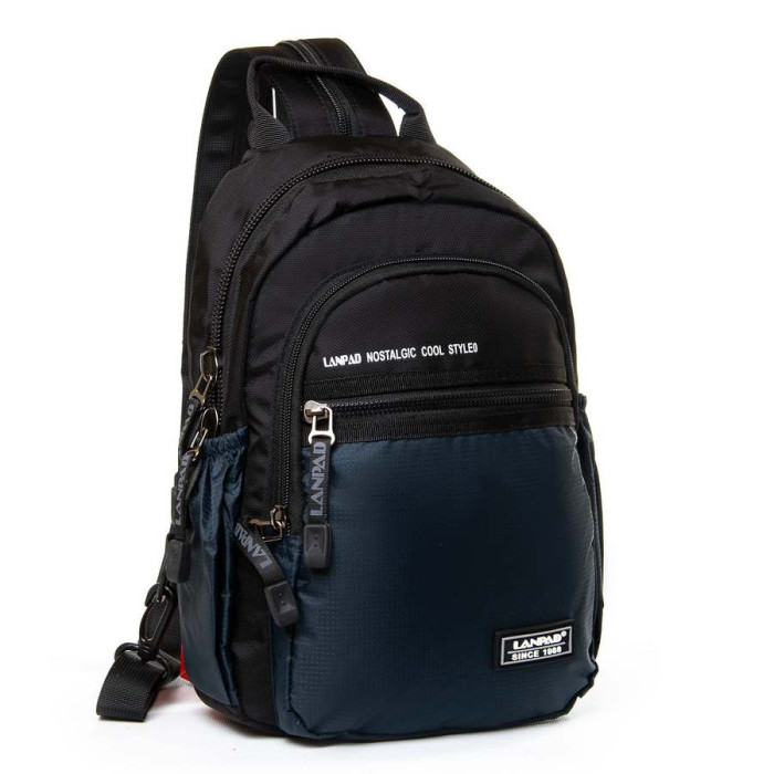 Чоловіча сумка-рюкзак Lanpad. Одне основне відділення закривається на блискавку. Усередині відділення є кишеня на блискавці та відкрита кишеня. На фасаді та зворотному боці знаходяться місткі кишені на блискавці. На бокових сторонах сумки є відкриті невеликі кишені.