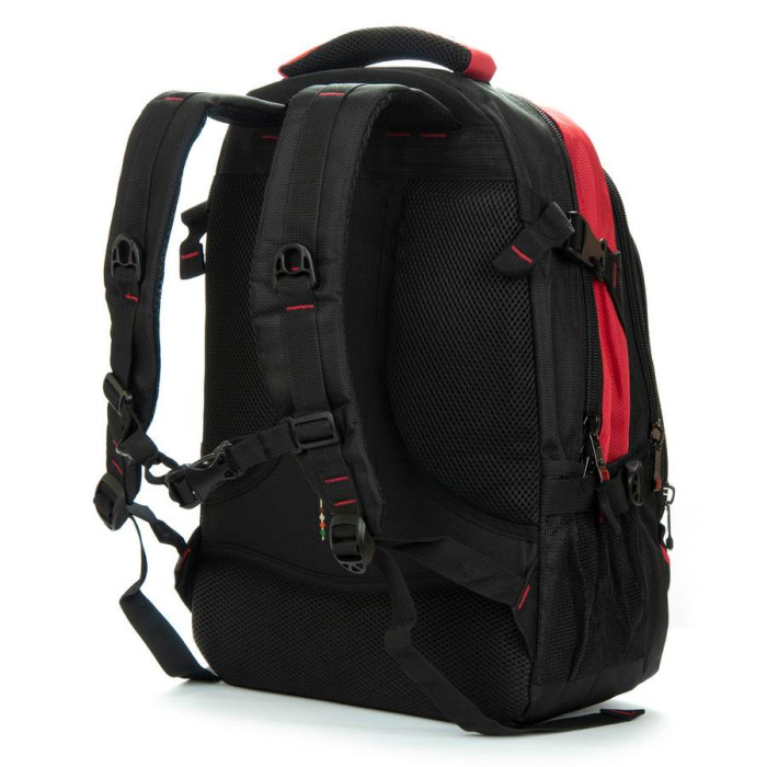 Щільна спинка з м'якими рельєфними вставками для вентиляції. Усередині рюкзака знаходяться три відділення на блискавці. У першому відділенні розташована кишеня-органайзер, а в третьому відділенні є кишеня для ноутбука і кишеня для телефону. Також, з основного відділення є вихід для навушників на зовнішню стінку рюкзака. На фасаді знаходиться кишеня на блискавці. Зовні на бічних сторонах рюкзака розташовані кишені-сітки для пляшок води об'ємом 0,5 літрів.