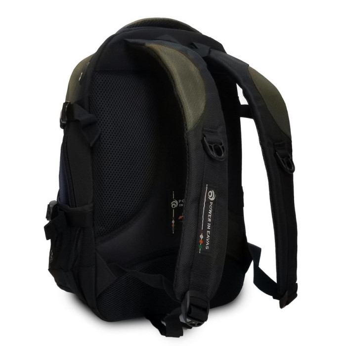 Міський рюкзак "Power in Eavas", щільна спинка з м'якими вставками. Усередині рюкзака два відділення на блискавці. У першому відділенні розташована кишеня-органайзер, у другому відділенні є кишеня для ноутбука та кишеня для телефону. На фасаді знаходяться дві кишені на блискавці. Зовні на бокових сторонах рюкзака кишені-сітки для пляшок води об'ємом 0,5 літра. Плечові лямки регулюються по довжині.
