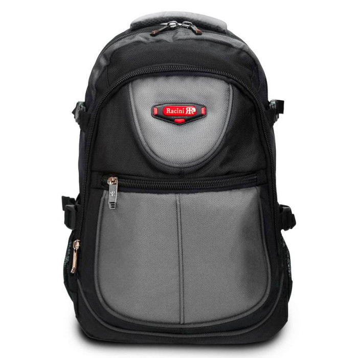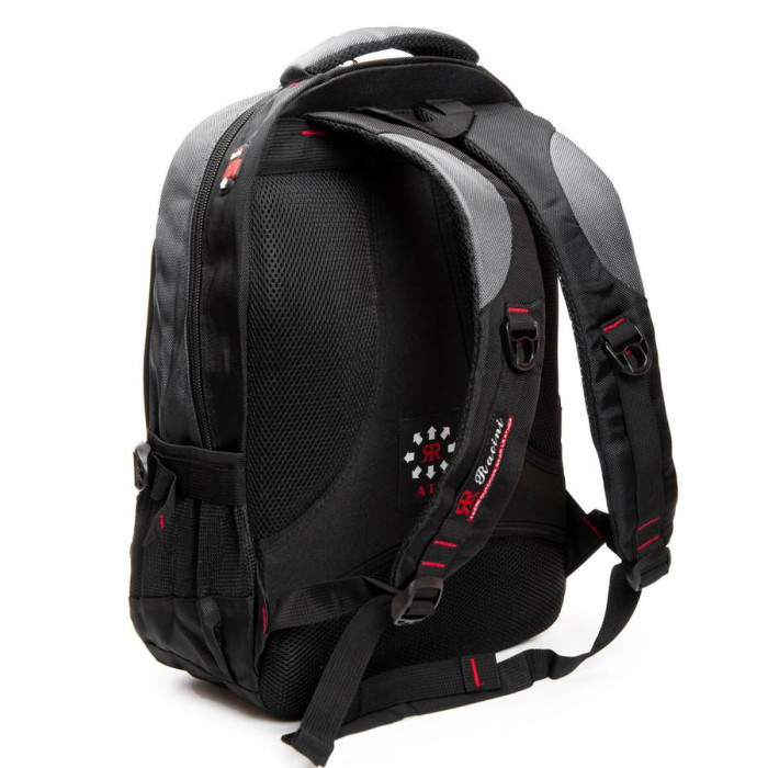 Міський рюкзак «Racini». Щільна спинка з м'якими вставками. Усередині рюкзака два відділення на блискавці. У першому відділенні розташована кишеня-органайзер, у другому відділенні є кишеня для ноутбука і кишеня для смартфона. На фасаді розташована містка кишеня на блискавці. Зовні на бічних сторонах рюкзака розташовані кишені-сітки для пляшок води об'ємом 0,5 літрів.