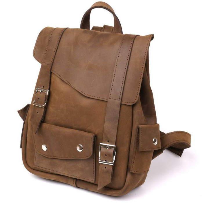 Зручний вінтажний рюкзак для міста. Варто звернути увагу, що в рюкзаку відсутня підкладка. Всередині рюкзака тильна сторона шкіри. Аксесуар доповнено сріблястою фурнітурою в дизайн. Рюкзак приємний на дотик. Надійно прошитий міцною ниткою в темних тонах, яка надає аксесуару родзинку. Шкіра, з якої виконаний рюкзак користується особливою популярністю серед багатьох клієнтів. Її вибирають за зовнішній вигляд, який змінюється в кращу сторону в процесі експлуатації, покриваючись розкішними потертостями.