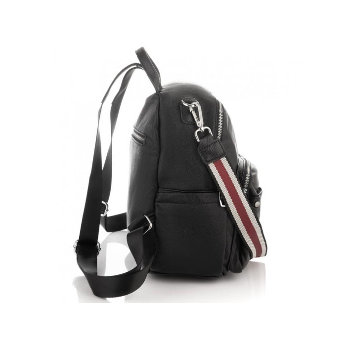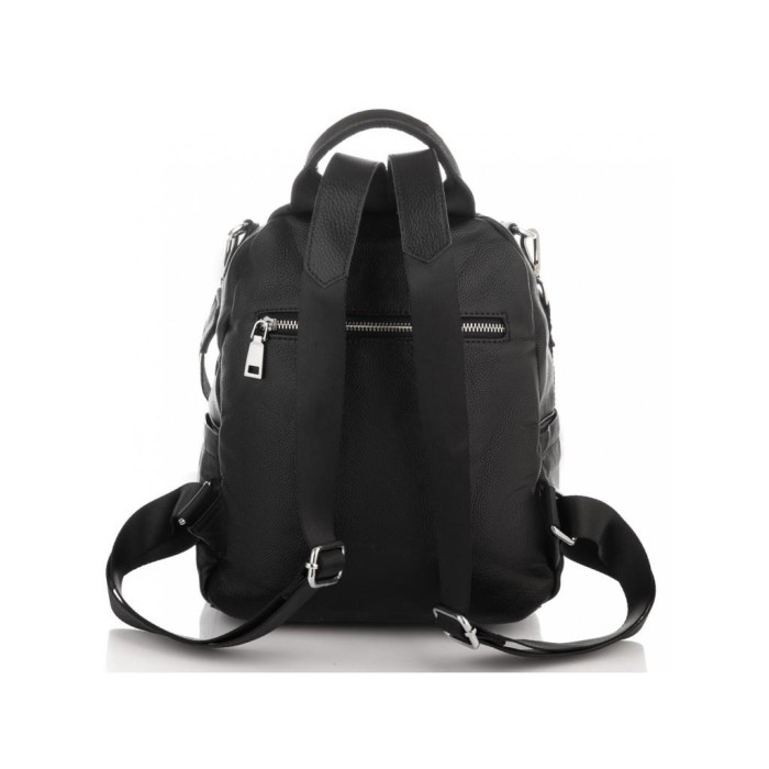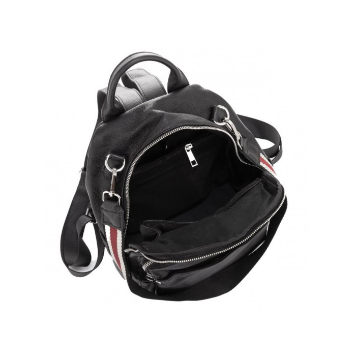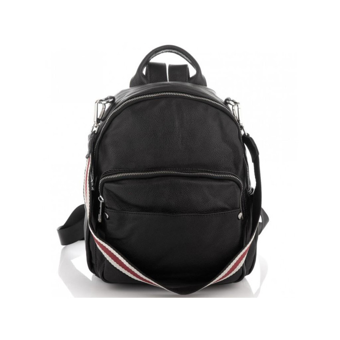 Компактний жіночий рюкзак чорного кольору на кожен день. Для зручного носіння є плечовий ремінь і шкіряна ручка для носіння в руці. З лицьового боку є кишеня на блискавці і на магніті. Також є основною відділ на блискавці, всередині якого є кишеня перегородка на блискавці, дві кишені відкритого типу і маленька кишеня на блискавки. З тильного боку додаткова кишеня на блискавки.
