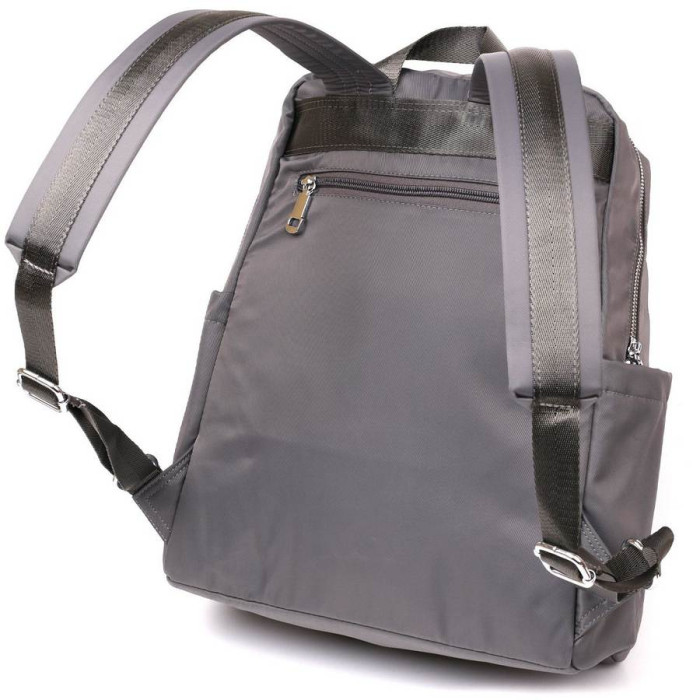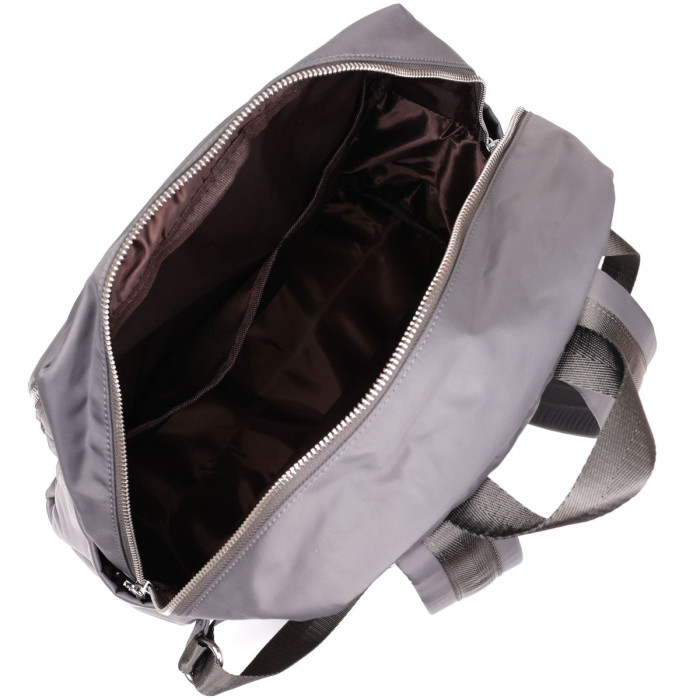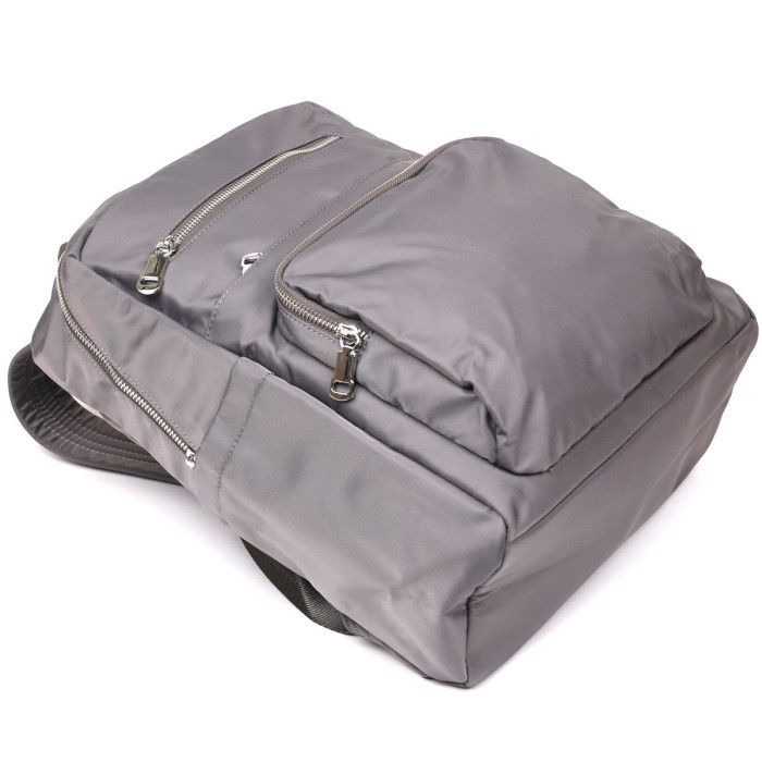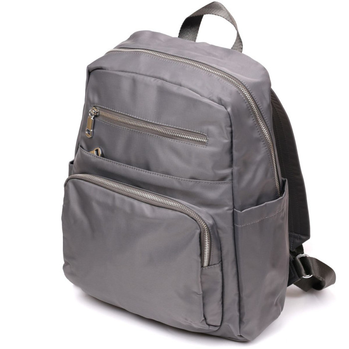 Сучасний міський рюкзак з якісного нейлону. Аксесуар доповнено міцною фурнітурою сріблястого кольору в дизайн рюкзака. По краях модель прошита сірою ниткою. Рюкзак не має важкої ваги і відмінно підійде як для ноутбука так і для навчання або роботи. З рюкзаком ви можете відправитися в нетривалу подорож або на пікнік. Аксесуар має відмінний функціонал з різноманітністю кишень, в які ви можете помістити гаманець, телефон, сигарети, воду, парасольку і інші необхідні речі для повсякденного життя. Аксесуар досить довго носиться і не вибагливий у догляді. Може бути прекрасним подарунком для близької людини. Упакований в тканинний захисний чохол.