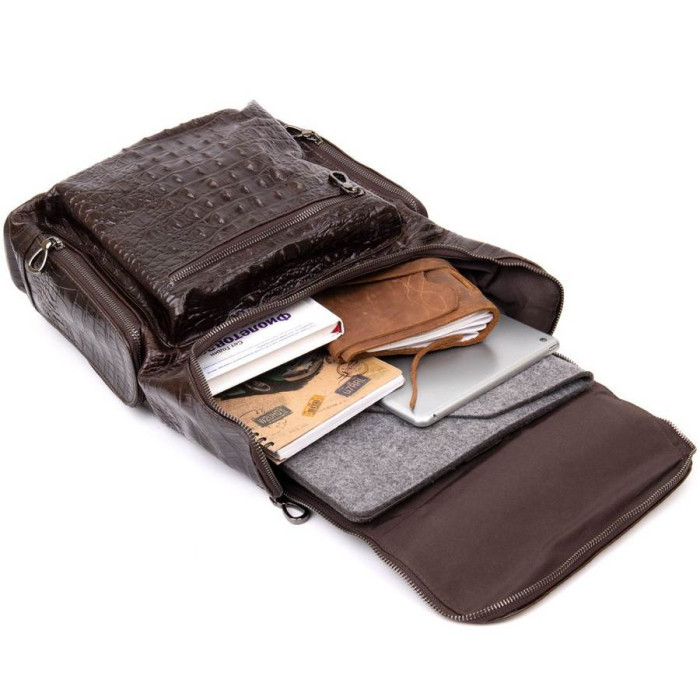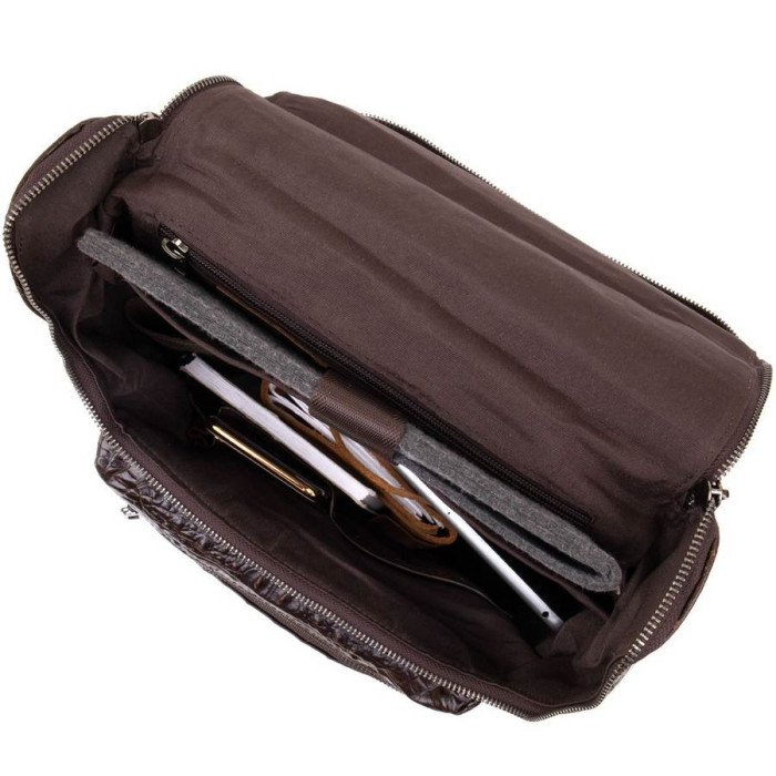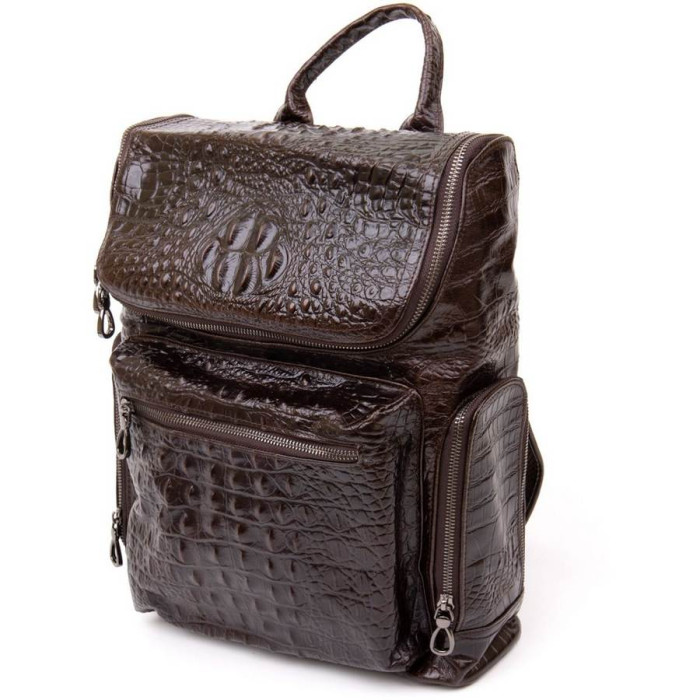 Місткий рюкзак з щільної, блискучої шкіри, яка тримає форму. Аксесуар виконаний в коричневому кольорі і доповнений якісною фурнітурою сріблястого кольору. Виріб під рептилію. Рюкзак дуже функціональний і практичний. Підійде дана модель як для подорожей, так і на кожен день і як рюкзак для ноутбука. Виглядає дуже солідно і дорого. З таким рюкзаком буде зручно і ваші руки залишаться вільними. На тильній стороні ущільнена спинка сіткою для вашого комфорту. Рекомендуємо рюкзак до покупки як для себе, так і на подарунок.