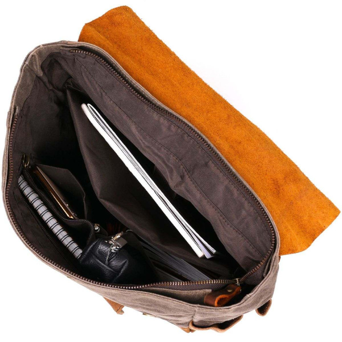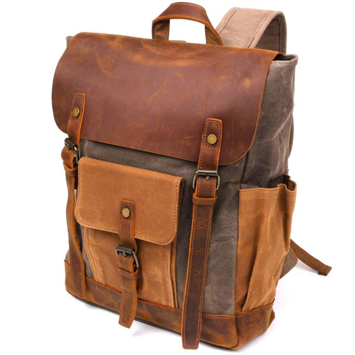Місткий похідний рюкзак зеленуватого відтінку в поєднанні міцного текстилю канвас і вінтажної шкіри. Рюкзак виконаний в дуже виграшній комбінації. Виріб прекрасно буде виглядати з різними стилями одягу від кежуал до спортивного. Одна модель підійде на кілька сезонів. Ми на 100 відсотків впевнені, що ви проносите рюкзак далеко не один рік. Доповнено рюкзак зручними бічними кишенями і кишенею на зовнішній стороні. У бічні кишеньки ви можете помістити пляшку з водою або парасольку. Якщо ви не знаєте що подарувати мандрівникові - купіть йому такий рюкзак. Без нього не обійдеться жодна подорож.