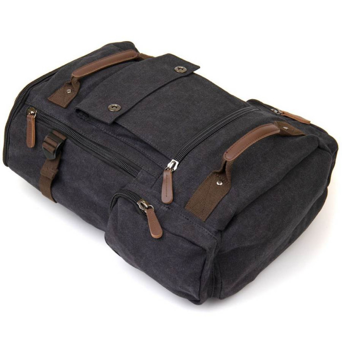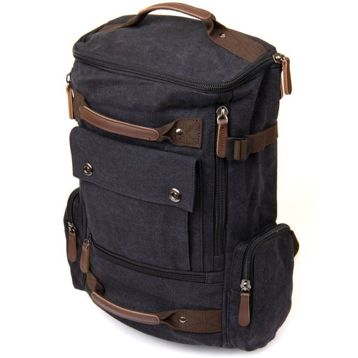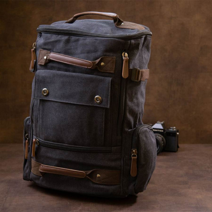 Великий рюкзак текстильний чорного кольору. Рюкзак дуже місткий. На лицьовій стороні рюкзак має кілька ручок для носіння в руках. Виріб має дуже практичний функціонал. Рюкзак підійде для подорожей і відряджень. Усередині рюкзака є ущільнена кишеня для ноутбука. Незважаючи на свій великий розмір рюкзак не важкий. Закривається рюкзак на блискавку. Всередині - якісна підкладка. Текстильний рюкзак - бюджетне рішення для вашого комфорту.