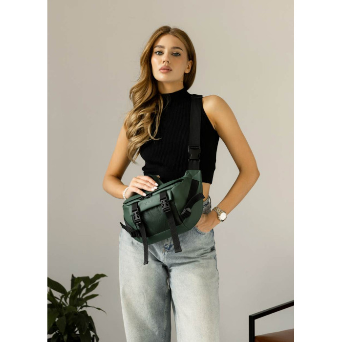 ззовні спереду сумки кишеня з сітки. Всередині сумки, окрім основного відділення, є дві відкриті кишені, одна велика кишеня на блискавці, в якій три відкритих відділення. Ззовні на спинці сумки дві відкриті кишені, куди легко поміститься телефон та інші дрібниці. Стандартний обхват (сумка з ременем) становить від 86 см до 168 см (довжина регулюється). При замовленні в коментарі зазначте необхідну довжину ременя, якщо вона відрізняється від стандартної.