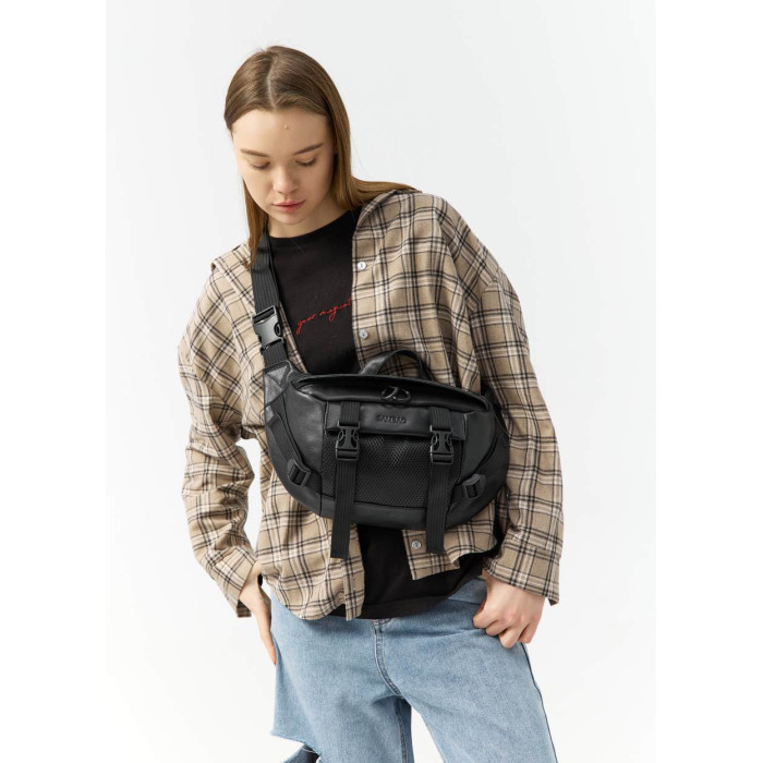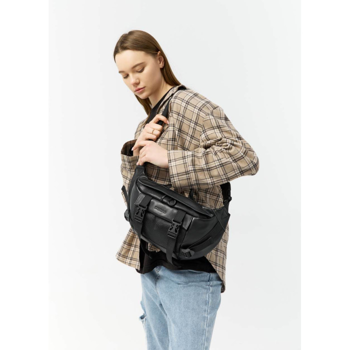Велика шкіряна жіноча поясна сумка бананка Sambag DynamicDart чорна