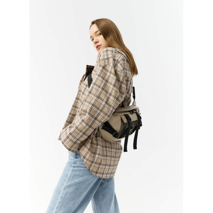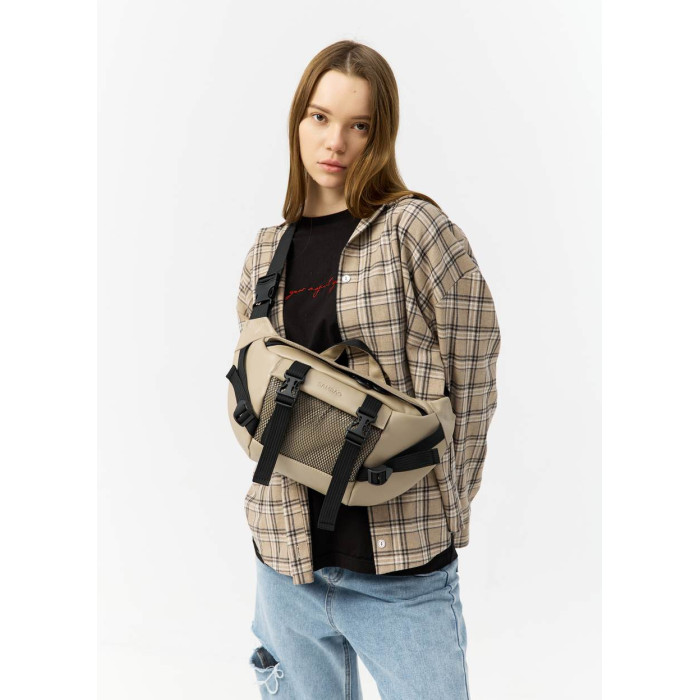 ззовні спереду сумки кишеня з сітки. Всередині сумки, окрім основного відділення, є дві відкриті кишені, одна велика кишеня на блискавці, в якій три відкритих відділення. Ззовні на спинці сумки дві відкриті кишені, куди легко поміститься телефон та інші дрібниці. Стандартний обхват (сумка з ременем) становить від 86 см до 168 см (довжина регулюється). При замовленні в коментарі зазначте необхідну довжину ременя, якщо вона відрізняється від стандартної.