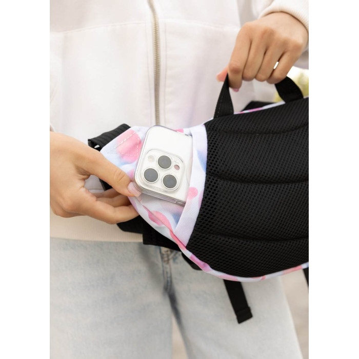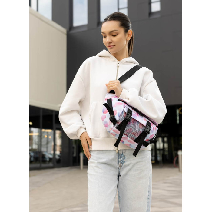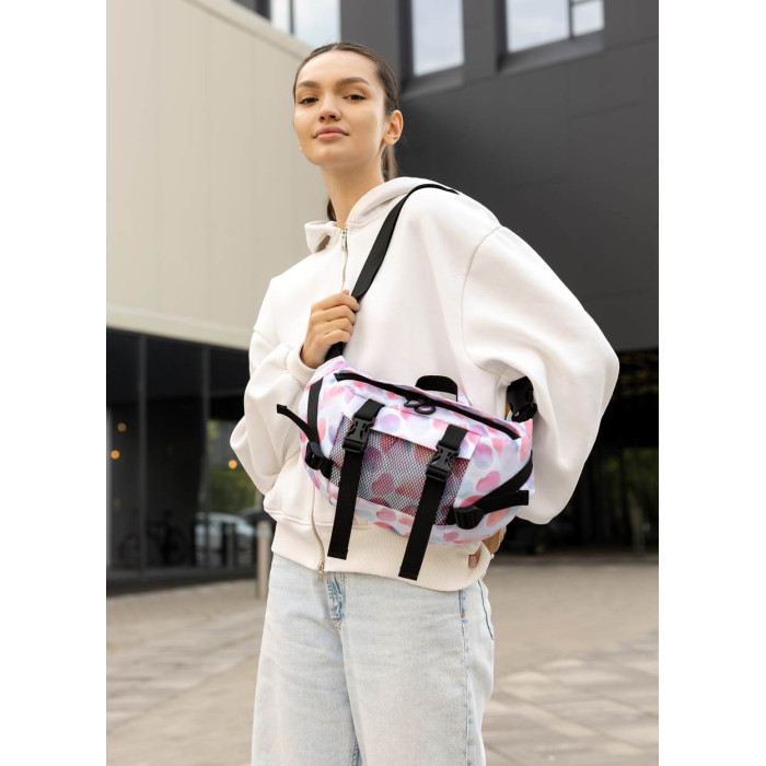 ззовні спереду сумки кишеня з сітки. Всередині сумки, окрім основного відділення, є дві відкриті кишені, одна велика кишеня на блискавці, в якій три відкритих відділення. Ззовні на спинці сумки дві відкриті кишені, куди легко поміститься телефон та інші дрібниці. Стандартний обхват (сумка з ременем) становить від 86 см до 168 см (довжина регулюється). При замовленні в коментарі зазначте необхідну довжину ременя, якщо вона відрізняється від стандартної.