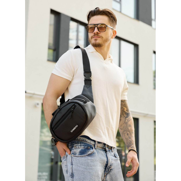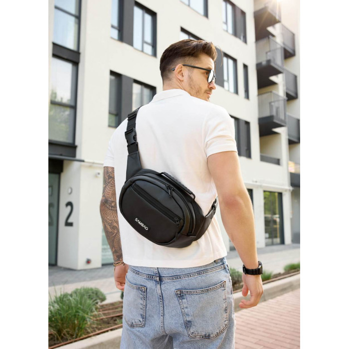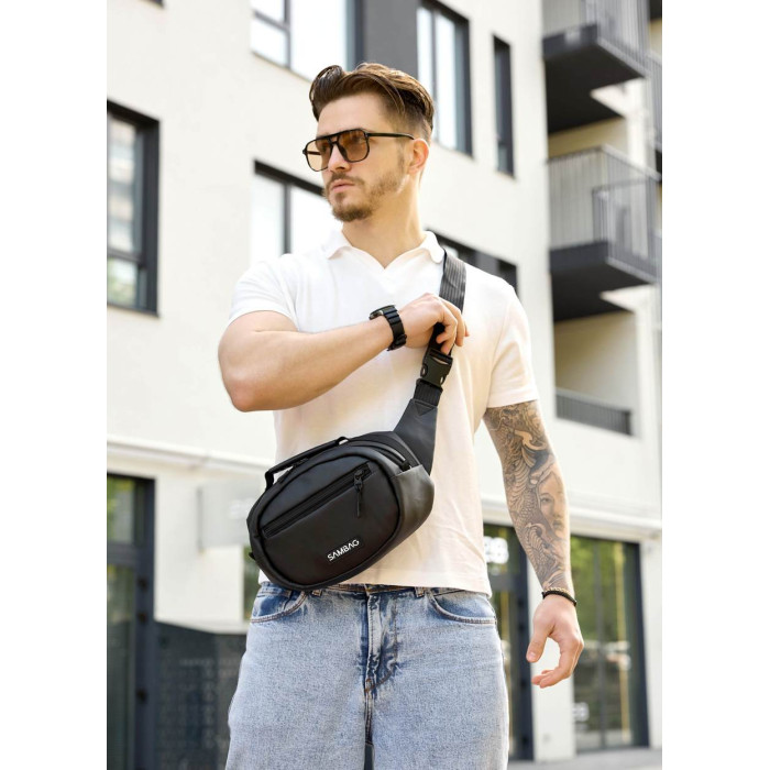 ззовні спереду сумки одна кишеня. Всередині сумки окреме одне основне відділення, кишеня на блискавці, відкрита кишеня та кишеня з сітки. Додатково має карабін для ключів. Ззовні на спинці сумки одна кишеня на блискавці. Спинка - вентиляційна, виконана з Air Mesh 3D. Стандартно поставляється на обхват по талії (через плече) від 86 см до 160 см: ремінь регулюється. При замовленні в коментарі зазначте необхідну довжину ременя, якщо вона відрізняється від стандартної.