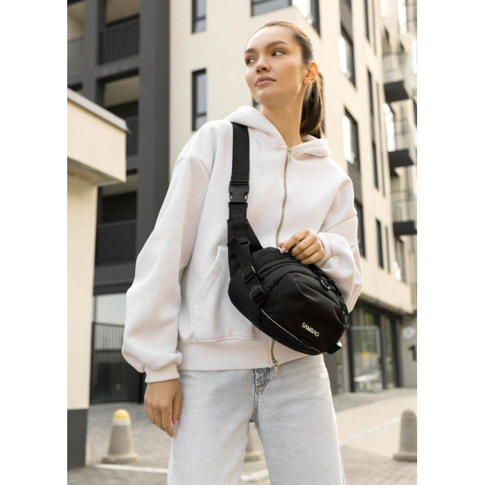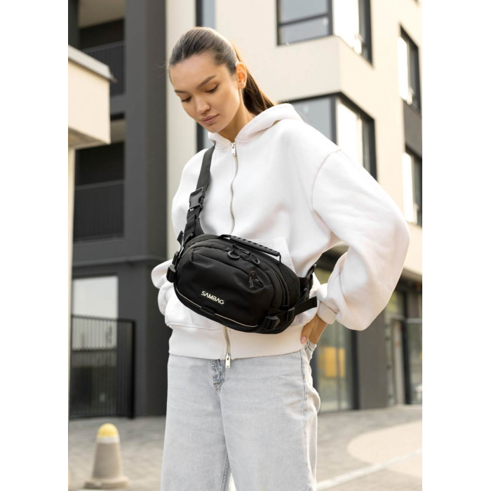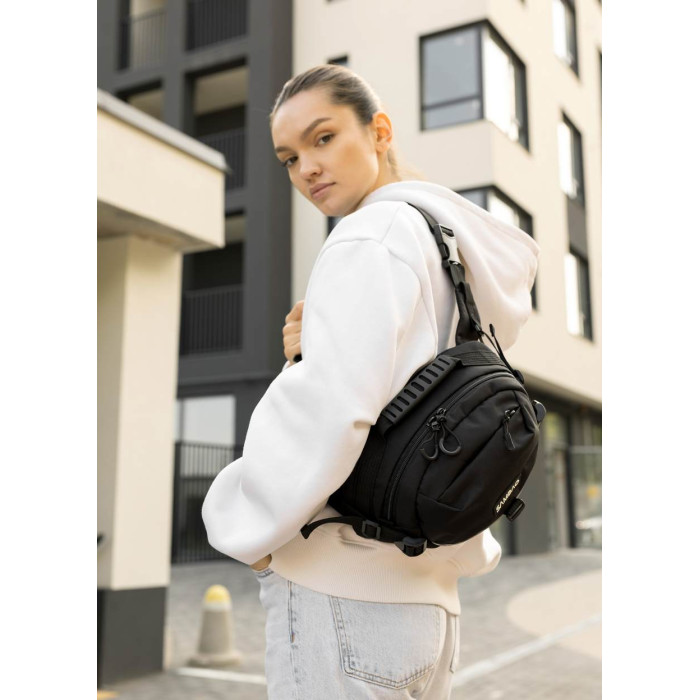 ззовні спереду сумки одна об'ємна кишеня на блискавці. Всередині сумки — окреме основне відділення, кишеня на блискавці, відкрита кишеня та кишеня з сітки. Додатково має карабін для ключів. Ззовні на спинці сумки одна кишеня на блискавці. Спинка - вентиляційна, виконана з Air Mesh 3D. З боків додаткові регулятори об'єму бананки. Стандартно поставляється на обхват по талії (через плече) від 86 см до 160 см: ремінь регулюється. При замовленні в коментарі зазначте необхідну довжину ременя, якщо вона відрізняється від стандартної.