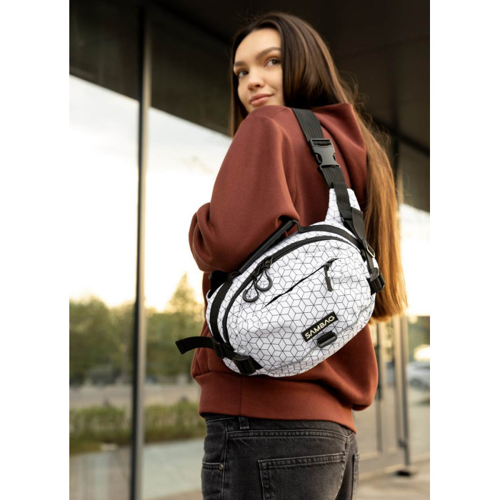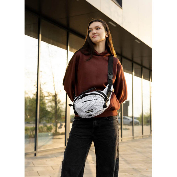ззовні спереду сумки одна об'ємна кишеня на блискавці. Всередині сумки — окреме основне відділення, кишеня на блискавці, відкрита кишеня та кишеня з сітки. Додатково має карабін для ключів. Ззовні на спинці сумки одна кишеня на блискавці. Спинка - вентиляційна, виконана з Air Mesh 3D. З боків додаткові регулятори об'єму бананки. Стандартно поставляється на обхват по талії (через плече) від 86 см до 160 см: ремінь регулюється. При замовленні в коментарі зазначте необхідну довжину ременя, якщо вона відрізняється від стандартної.