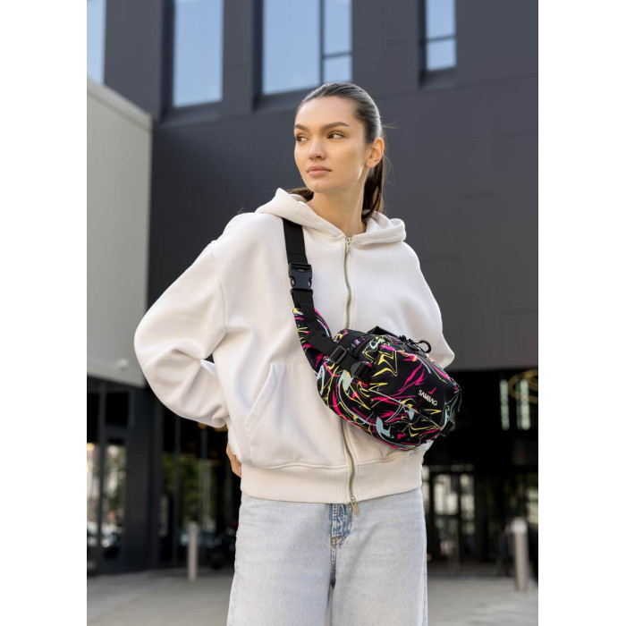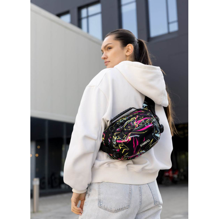 ззовні спереду сумки одна об'ємна кишеня на блискавці. Всередині сумки — окреме основне відділення, кишеня на блискавці, відкрита кишеня та кишеня з сітки. Додатково має карабін для ключів. Ззовні на спинці сумки одна кишеня на блискавці. Спинка - вентиляційна, виконана з Air Mesh 3D. З боків додаткові регулятори об'єму бананки. Стандартно поставляється на обхват по талії (через плече) від 86 см до 160 см: ремінь регулюється. При замовленні в коментарі зазначте необхідну довжину ременя, якщо вона відрізняється від стандартної.