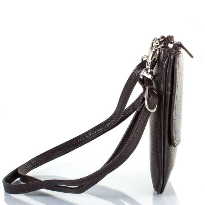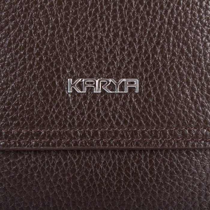 Кількість основних відділень: 1. Усередині є прорізна кишеня на блискавці. На лицьовій стороні моделі є два прорізних кишені (один з них на блискавці). Обидва кишені закриваються на загальний клапан з магнітною кнопкою. На тильній стороні є прорізна кишеня на блискавці. У комплект до моделі додається знімний плечовий ремінь регульованої довжини (від 89 до 150 см). Барсетка придатна до носіння на плечі, через плече. Підкладка виготовлена з щільної тканини. Матеріал: шкіра флотар. Колір: темний коричневий. Колір фурнітури: срібло. Зовнішні розміри: 17*20,5*1,5 см. Виріб закривається за допомогою блискавки. Документи формату А4 не поміщаються у виробі. Аксесуар упакований в поліетиленовий пакет, а також фірмовий тканинний чохол. Країна походження торгової марки Karya - Туреччина. Гарантія: 3 місяці.