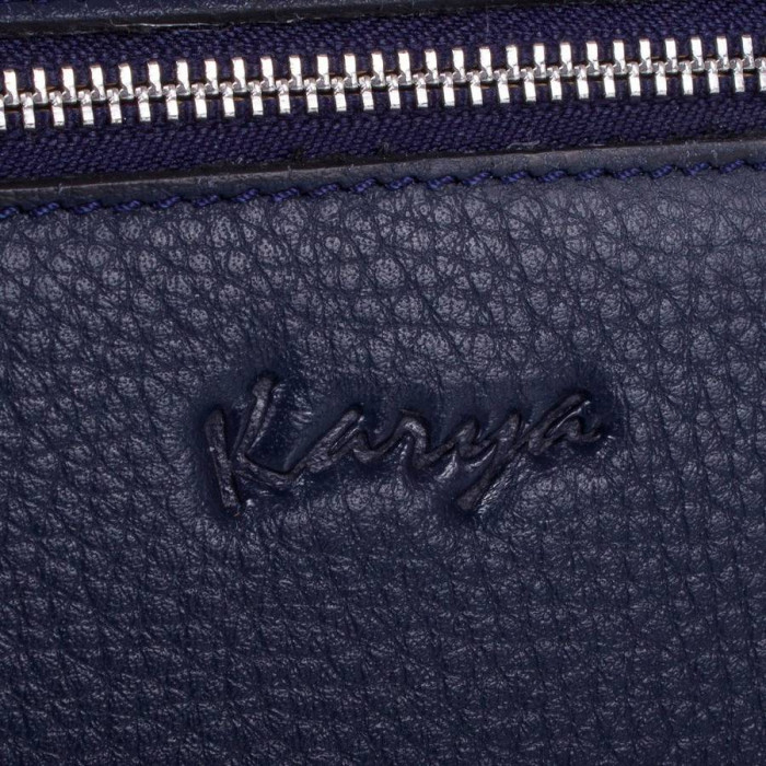 Кількість основних відділень: 2. Всередині є 8 кишені для візиток, банківських та дисконтних карток, 2 горизонтальних накладних кишені, відділення для смартфона. На зовнішній стороні є прорізна кишеня на блискавці. У комплект до моделі додається знімний зап'ястного ремінець-петля. Його довжина не регулюється і становить 22 см. Барсетка придатна до носіння в руці, на зап'ясті. Виріб має жорсткий каркас. Це означає, що воно не буде м'ятися і деформуватися в процесі використання. Підкладка виготовлена з щільної тканини. Матеріал: шкіра флотар. Колір: темний синій. Колір фурнітури: срібло. Зовнішні розміри: 21*12*2,5 см. Виріб закривається за допомогою блискавки. Документи формату А4 не поміщаються у виробі. Аксесуар упакований в картонну коробку. Країна походження торгової марки Karya - Туреччина. Гарантія: 3 місяці.