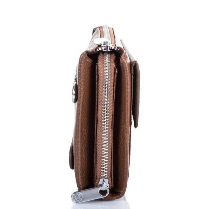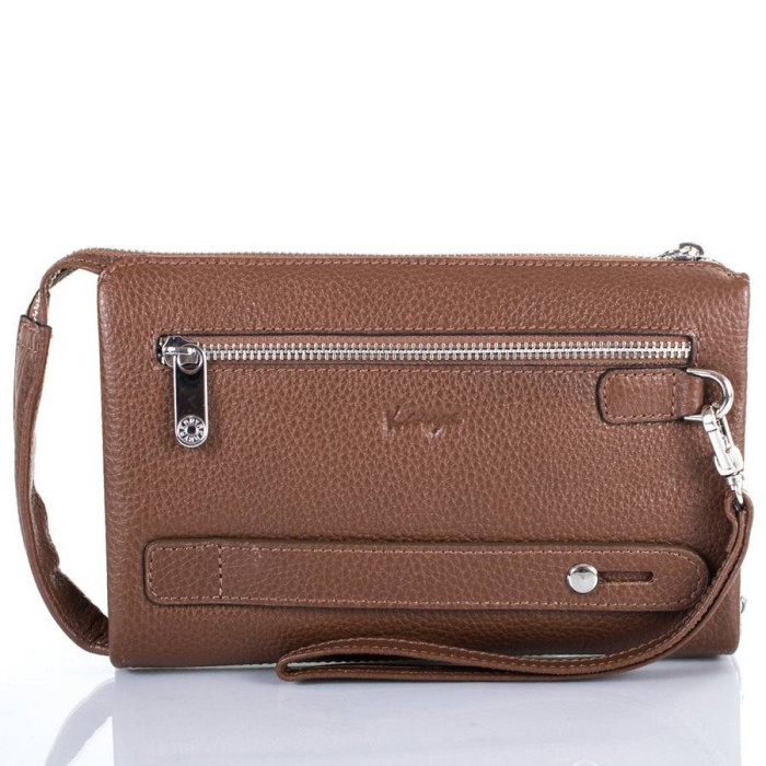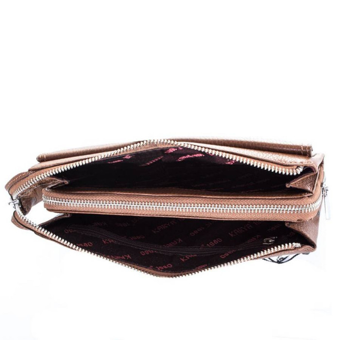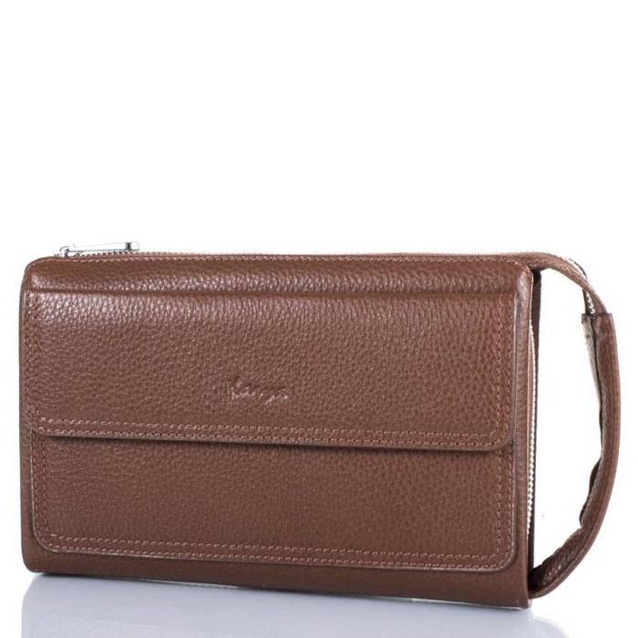 Кількість основних відділень: 4. Всередині є 4 кишеньки для візиток, банківських та дисконтних карток, прорізна кишеня і кишеню-перегородка (обидва на блискавці). На зовнішній стороні виробу є велика накладна кишеня на клапані з потайними магнітними застібками. На тильній стороні є прорізна кишеня на блискавці. Барсетка має дві незнімні ручки стабільної довжини, які дозволяють носити аксесуар вертикально або горизонтально. У комплект до моделі додається знімний зап'ястного ремінець-петля. Його довжина не регулюється і становить 22 см. Барсетка придатна до носіння в руці, на зап'ясті. Виріб має жорсткий каркас. Це означає, що воно не буде м'ятися і деформуватися в процесі використання. Підкладка виготовлена з щільної тканини. Матеріал: шкіра флотар. Колір: тютюновий коричневий. Колір фурнітури: срібло. Зовнішні розміри: 22*14,5*4 см. Виріб закривається за допомогою блискавки. Документи формату А4 не поміщаються у виробі. Аксесуар упакований в тканинний чохол. Країна походження торгової марки Karya - Туреччина. Гарантія: 3 місяці.