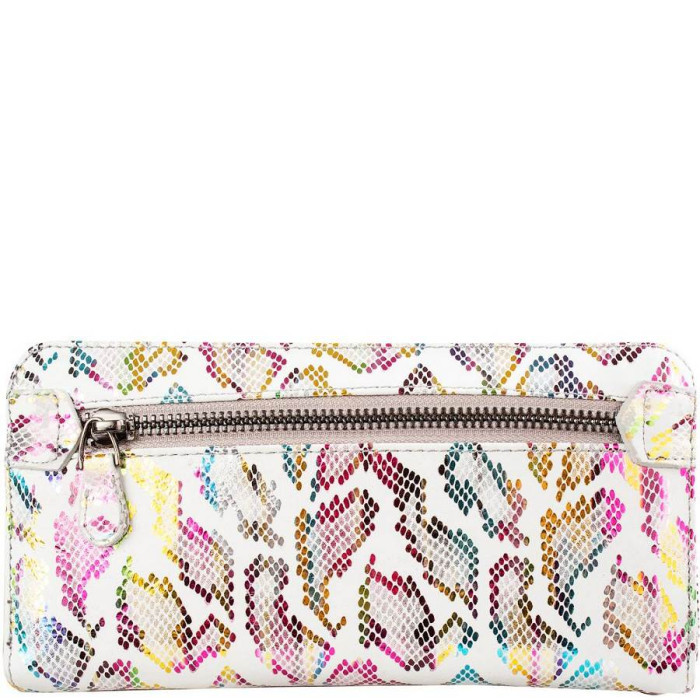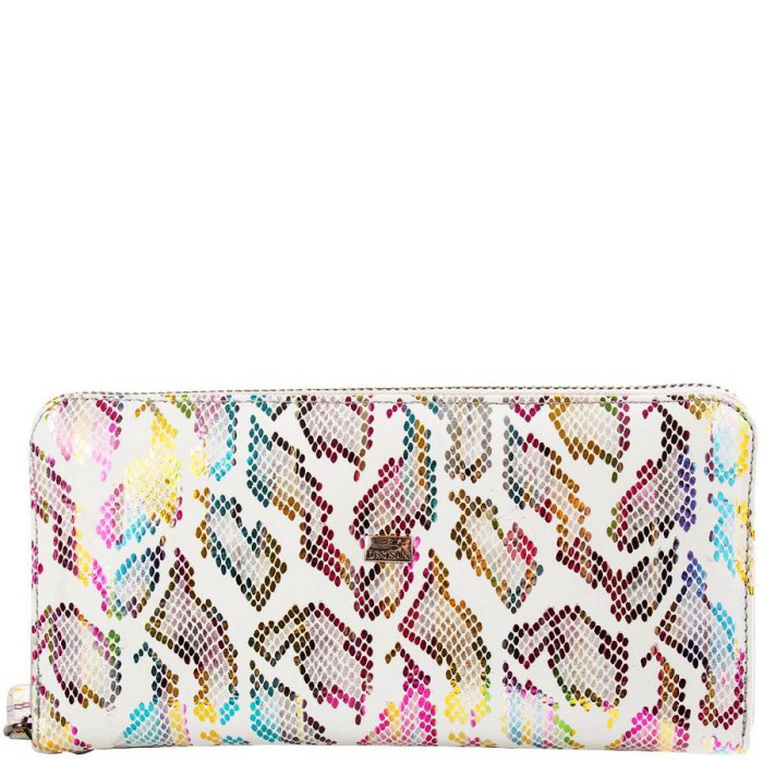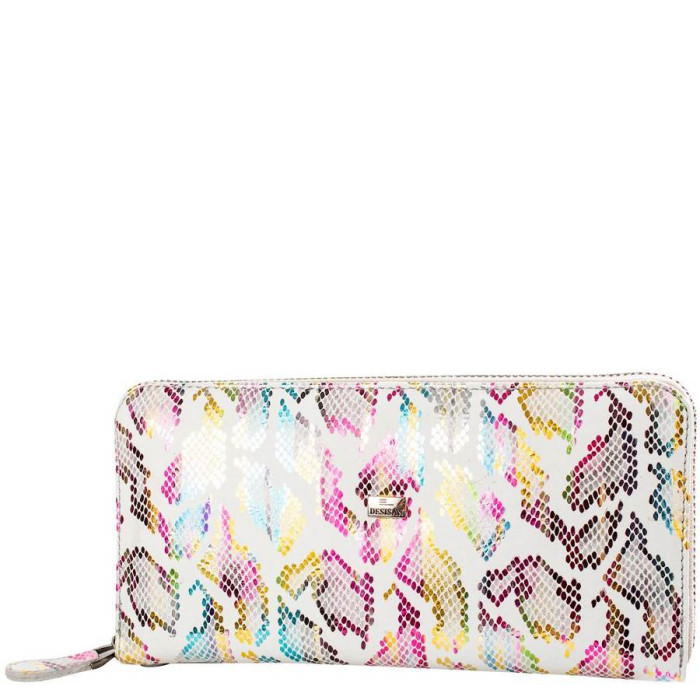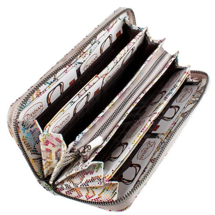 Розміри (X * Y * Z): 20 х 10 х 3 см. Матеріал виробу: шкіра. Колір: білий, різнокольоровий. Колір фурнітури: чорне срібло. Кількість відділень для купюр: 4. Гарантія: 1 місяць. Додаткові відділення: 3. Одне з них знаходиться зовні і закривається на блискавку. Відділення для карт: 36. Відділення для дрібниці: 1. Монетниця закривається за допомогою блискавки. Аксесуар застібається за допомогою блискавки. У комплекті є знімна ручка, довжина якої не регулюється і складає 16,5 см. Виріб упаковано в поліетиленовий пакет. Країна походження ТМ Desisan - Туреччина.