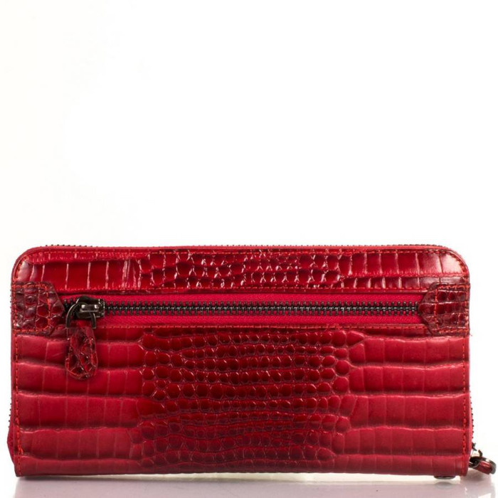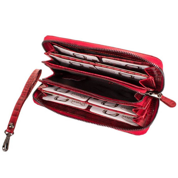 У дизайні цього жіночого гаманця з'єдналися відтінки червоного, місцями переходять в насичений, близький до бордового кольору, і ефектне тиснення під шкіру рептилії. Сильний варіант! Він не надто яскравий, а виглядає помітно й тому займе чільне місце в гардеробі. Рельєфна поверхня і сподручная прямокутна форма, плюс кистьовий ремінець, який можна пристебнути карабіном, приємні і зручні для того, щоб тримати такий аксесуар в руці, і в надрах повсякденної сумки він теж не загубиться - Ви швидко дістанете його біля каси або банкомату, щоб зробити потрібні платежі. Висока якість штучки марки DESISAN послужить гарантією того, що Ви довго не захочете розставатися з такою обновкою. Ціна, за якою брендовий турецький гаманець можна придбати в магазині «ЕМІЛІ», виправдає себе, адже таку річ здобуваєш не на один день.
