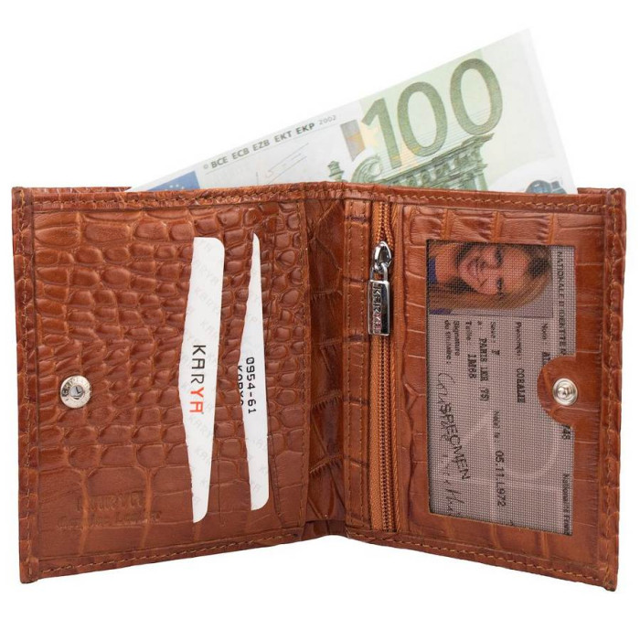 Розміри (X * Y * Z): 9,5 х 10,5 х 2,5 см. Ширина в розкритому вигляді: 19 см. Матеріал виробу: шкіра. Колір: коричневий. Колір фурнітури: срібло. Гарантія: 1 місяць. Кількість основних відділень (для купюр): 2. Одне з них закривається за допомогою блискавки. Додаткових відділень: 2. Кількість відділень для карт: 3. Відділення з прозорими віконцями: 1. Відділення для дрібниці: 1. Закривається за допомогою блискавки. Аксесуар закривається за допомогою механічної застібки . Виріб упаковано в фірмову картонну коробку. Країна походження торгової марки KARYA - Туреччина.