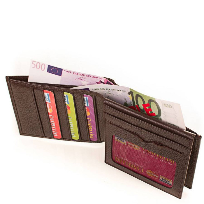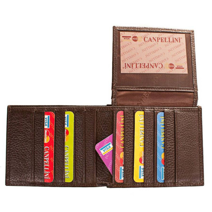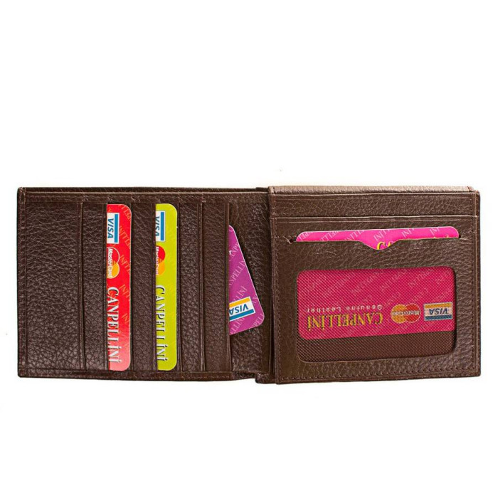 Кількість основних відділень (для купюр): 2. Відділення для фотокарток, перепусток, проїзних квитків та інших документів: 2. Відділення для візиток, банківських та дисконтних карток: 13. Додаткові відділення: 2. Матеріал виробу: шкіра флотар. Колір: коричневий. Колір фурнітури: срібло. Розміри (X*Y*Z): 12,5*9,5*1,7 см. В розкритому вигляді ширина виробу становить 24,5 см. Аксесуар виконаний без застібки. Виріб упакований у фірмову коробку з щільного картону. Країна походження торгової марки Canpellini - Туреччина. Гарантія: 1 місяць.